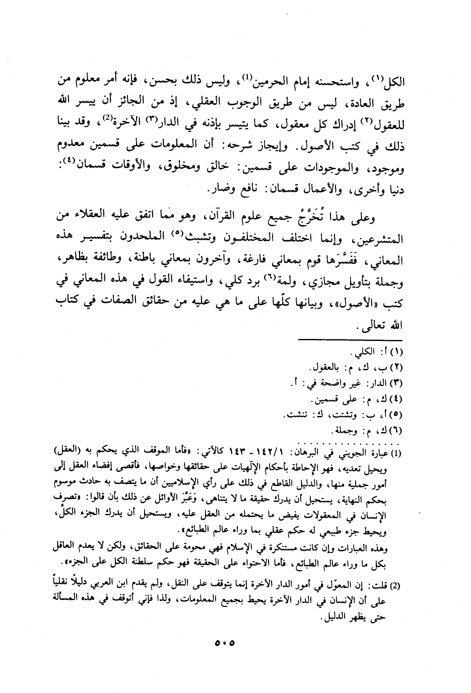 (¬1) عبارة الجويني في البرهان: 1/ 142 - 143 كالآتي: "فأما الموقف الذي يحكم به (العقل) ويحيل تعديه، فهو الإحاطة بأحكام الإلهيات على حقائقها وخواصها، فأقصى إفضاء العقل إلى أمور جملية منها، والدليل القاطع في ذلك على رأي الإِسلاميين أن ما يتصف به حادث موسوم بحكم النهاية، يستحيل أن يدرك حقيقة ما لا يتناهى، وَعَبَّرَ الأوائل عن ذلك بأن قالوا: "تصرف الإنسان في المعقولات يفيض ما يحتمله من العقل عليه، ويستحيل أن يدرك الجزء الكل، ويحيط جزء طبيعي له حكم عقلي بما وراء عالم الطبائع".