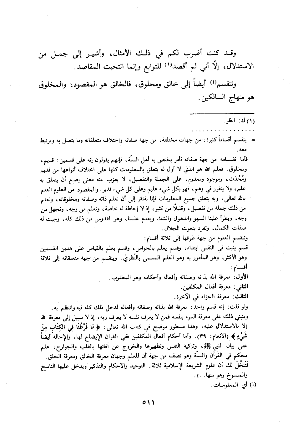 وتنقسم (¬1) أيضاً إلى خالق ومخلوق، فالخالق هو المقصود، والمخلوق هو منهاج السالكين.