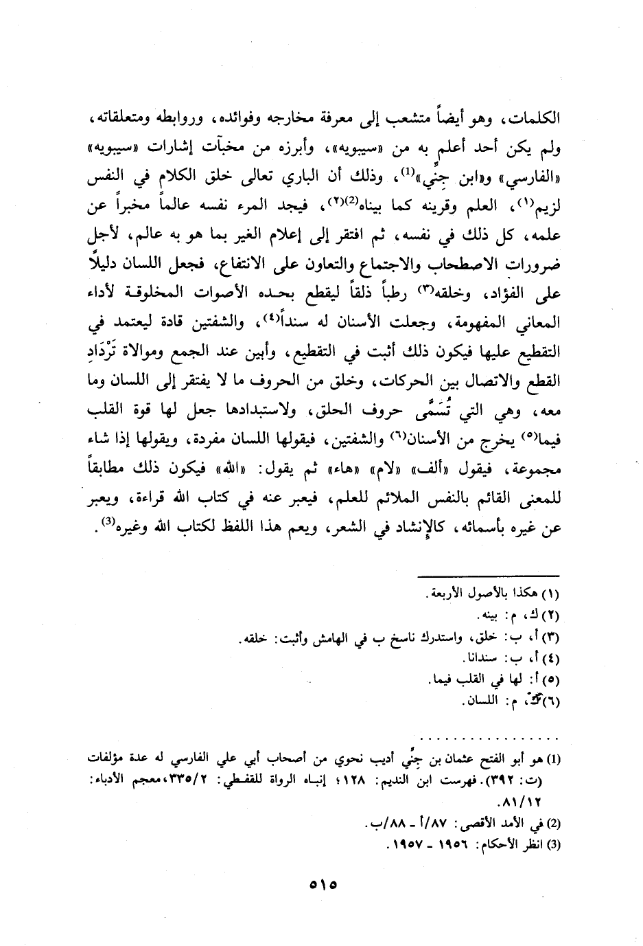 (¬1) هو أبو الفتح عثمان بن جِنِّي أديب نحوي من أصحاب أبي علي الفارسي له عدة مؤلفات (ت / 392) فهرست ابن النديم: 128؛ إنباه الرواة للقفطي 2/ 335، معجم الأدباء: 12/ 81.