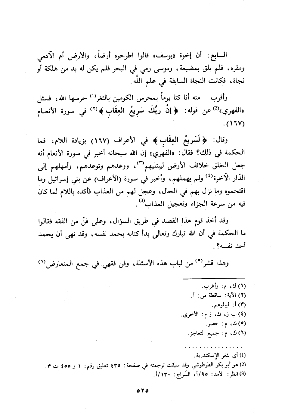 وأقرب منه أنا كنا يوماً بمحرس الكومين بالثغر (¬1) حرسها الله، فسئل "الفهري" (¬2) عن قوله: {إِنَّ رَبَّكَ سَرِيعُ الْعِقَابِ} في سورة الأنعام (165).
