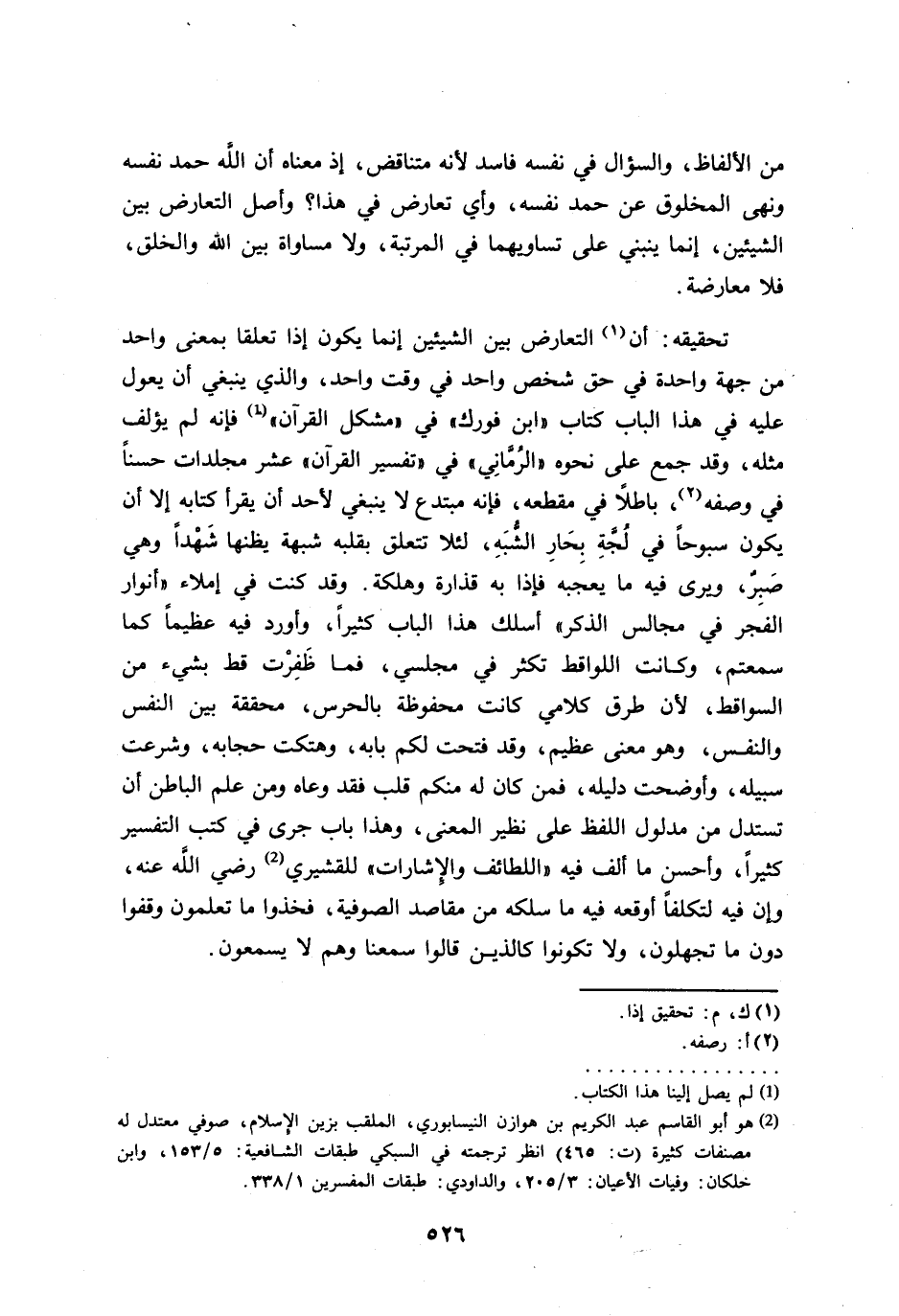 تحقيقه: أن التعارض بين الشيئين إنما يكون إذا تعلقا بمعنى واحد من جهة واحدة في حق شخص واحد في وقت واحد، والذي ينبغي أن يعول عليه في هذا الباب كتاب "ابن فورك" في "مشكل القرآن" (¬1) فإنه لم يؤلف مثله، وقد جمع على نحوه "الرُمَّانِي" في "تفسير القرآن" عشر مجلدات حسناً في وصفه، باطلاً في مقطعه، فإنه مبتدع لا ينبغي لأحد أن يقرأ كتابه إلا أن يكون سبوحاً في لُجَّةِ بحَارِ الشُّبَهِ، لئلا تتعلق بقلبه شبهة يظنها شَهْداً وهي صبِر، ويرى فيه ما يعجبه فإذا به قذارة وهلكة. وقد كنت في إملاء "أنوار الفجر في مجالس الذكر" أسلك هذا الباب كثيراً، وأورد فيه عظيماً كما سمعتم، وكانت اللواقط تكثر في مجلسي، فما ظَفِرْت قط بشيء من السواقط، لأن طرق كلامي كانت محفوظة بالحرس، محققة بين النفس والنفس، وهو معنى عظيم، وقد فتحت لكم بابه، وهتكت حجابه، وشرعت سبيله، وأوضحت دليله، فمن كان له منكم قلب فقد وعاه ومن علم الباطن أن تستدل من مدلول اللفظ على نظير المعنى، وهذا باب جرى في كتب التفسير كثيراً، وأحسن ما ألف فيه "اللطائف والإشارات" للقشيري (¬2) رضي الله عنه، وإن فيه لتكلفاً أوقعه فيه ما سلكه من مقاصد الصوفية، فخذوا ما تعلمون وقفوا دون ما تجهلون، ولا تكونوا كالذين قالوا سمعنا وهم لا يسمعون.