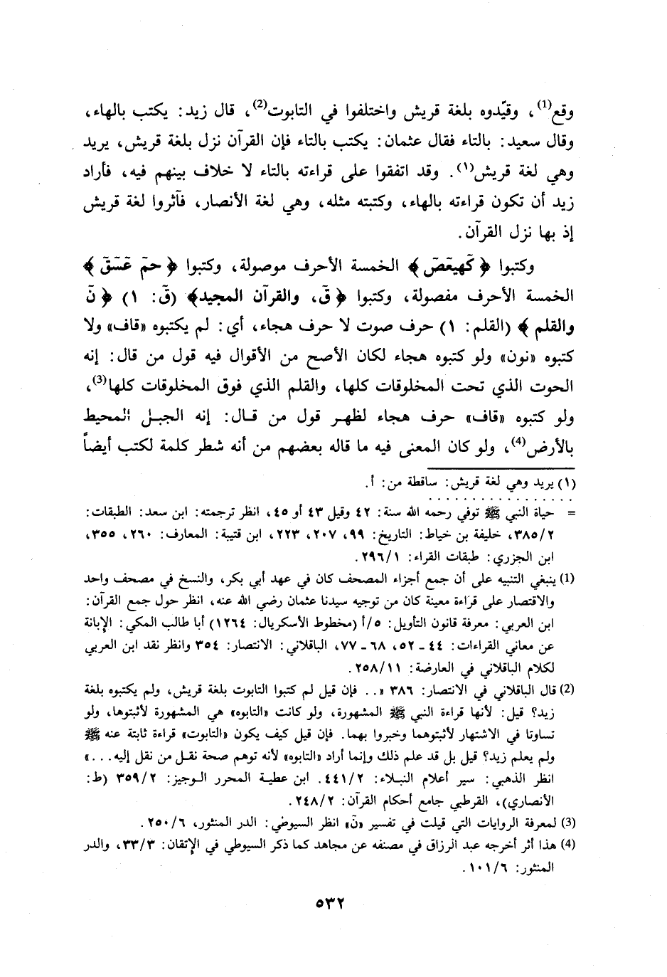 (¬2) قال الباقلاني في الانتصار: 386 " .. فإن قيل لم كتبوا التابوت بلغة قريش، ولم يكتبوه بلغة زيد؟ قيل: لأنها قراءة النيي - صلى الله عليه وسلم - المشهورة، ولو كانت "التابوه" هي المشهورة لأثبتوها، ولو تساوتا في الاشتهار لأثبتوهما وخبروا بهما. فإن قيل كيف يكون "التابوت" قراءة ثابتة عنه - صلى الله عليه وسلم - ولم يعلم زيد؟ قيل بل قد علم ذلك وإنما أراد "التابوه" لأنه توهم صحة نقل من نقل إليه ... " انظر الذهبي: سير أعلام النبلاء: 2/ 441. ابن عطية المحرر الوجيز: 2/ 359 (ط: الأنصاري)، القرطبي جامع أحكام القرآن: 2/ 248.