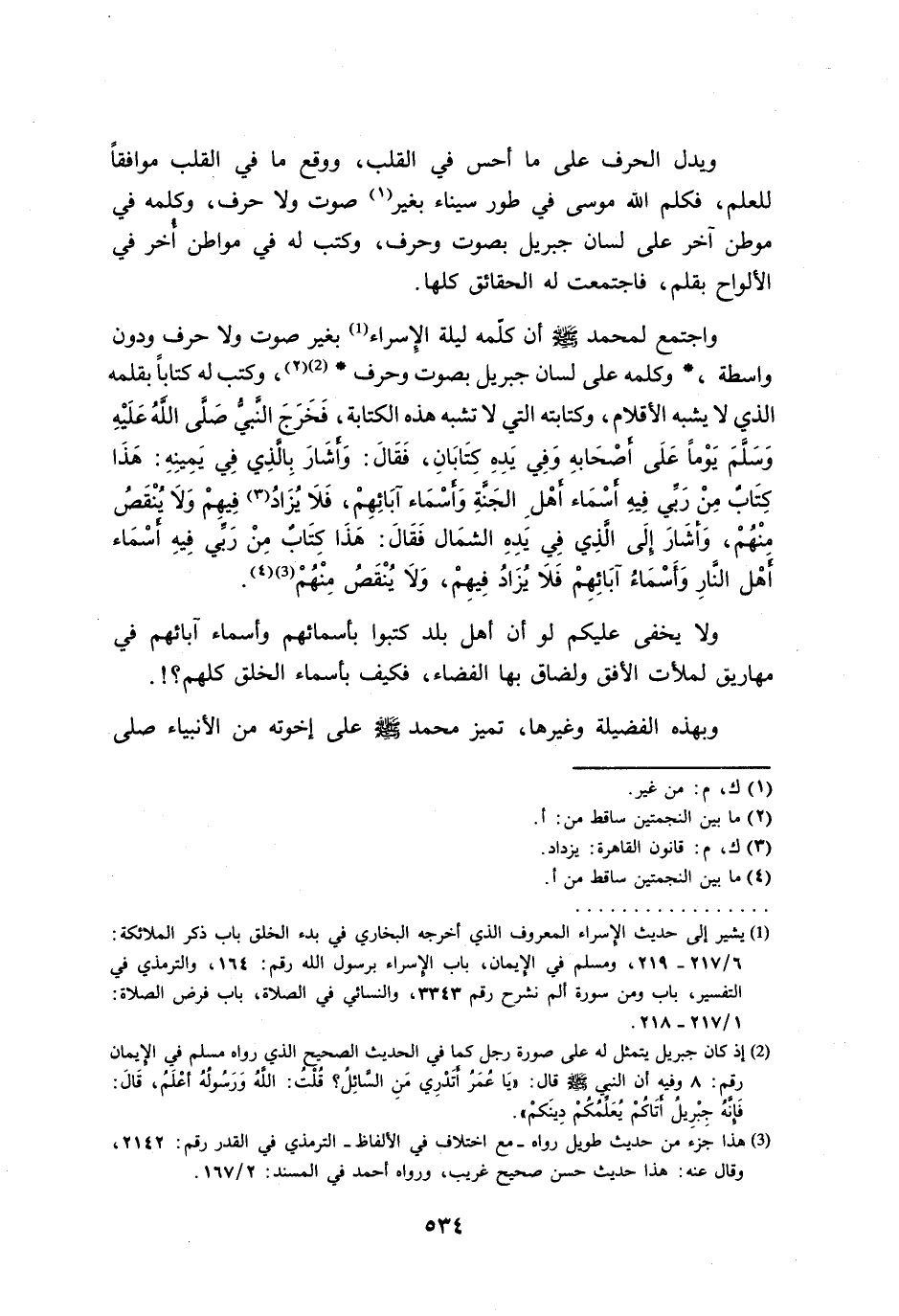 واجتمع لمحمد - صلى الله عليه وسلم - أن كلمه ليلة الِإسراء (¬1) بغير صوت ولا حرف ودون واسطة، وكلمه على لسان جبريل بصوت وحرف (¬2)، وكتب له كتاباً بقلمه الذي لا يشبه الأقلام، وكتابته التي لا تشبه هذه الكتابة، فَخَرَجَ النبي صَلى اللهُ عَلَيْهِ وَسَلمَ يَوْماً عَلَى أصحَابهِ وَفِي يَدِهِ كِتَابَانِ، فَقَالَ: وَأشَارَ بِالذِي فِي يَمِينِهِ: هَذَا كِتَابٌ مِنْ رَبي فِيهِ أسْمَاء أهْلِ الجَنةِ وَأسْمَاء آبَائِهِمْ، فَلَا يُزَادُ فِيهِمْ وَلَا يُنْقَصُ مِنْهُمْ، وَأشَارَ إلَى الذِي فِي يَدِهِ الشمَال فَقَالَ: هَذَا كِتَابٌ مِنْ رَبَي فِيهِ أسْمَاء أهْل النَارِ وَأَسْمَاءُ آبَائِهِمْ فَلَا يُزَادُ فِيهِمْ، وَلَا يُنْقَصُ مِنْهُمْ (¬3).