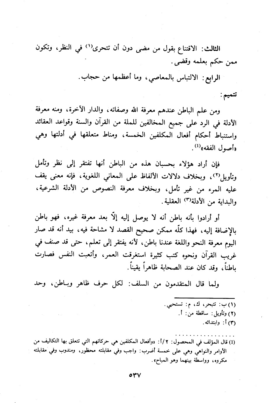 ومن علم الباطن عندهم معرفة الله وصفاته، والدار الآخرة، ومنه معرفة الأدلة في الرد على جميع المخالفين للملة من القرآن والسنة وقواعد العقائد واستنباط أحكام أفعال المكلفين الخمسة، ومناط متعلقها في أدلتها وهي "أصول الفقه" (¬1).