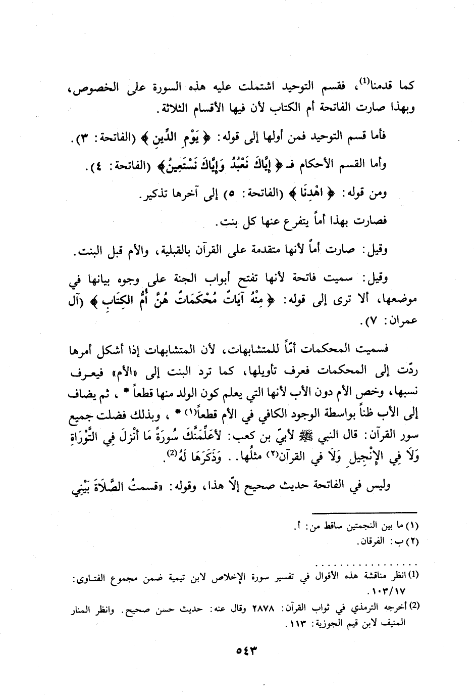 كما قدمنا (¬1)، فقسم التوحيد اشتملت عليه هذه السورة على الخصوص، وبهذا صارت الفاتحة أم الكتاب لأن فيها الأقسام الثلاثة.