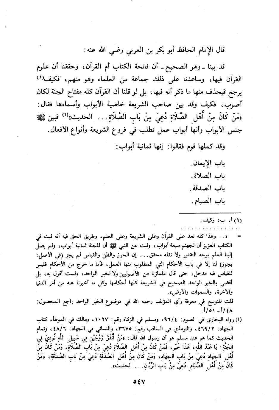 قد بينا -وهو الصحيح- أن فاتحة الكتاب أم القرآن، وحققنا أن علوم القرآن فيها، وساعدنا على ذلك جماعة من العلماء وهو منهم، فكيف يرجع فيحذف منها ما ذكر أنه فيها، بل لو قلنا أن القرآن كله مفتاح الجنة لكان أصوب، فكيف وقد بين صاحب الشريعة خاصية الأبواب وأسماءها فقال: "مَنْ كَانَ مِنْ أهْل الصلاةِ دُعِيَ مِنْ بَابِ الصلاة ... الحديث" (¬1) فبين - صلى الله عليه وسلم - جنس الأبواب وأنها أبواب عمل تطلب في فروع الشريعة وأنواع الأفعال.