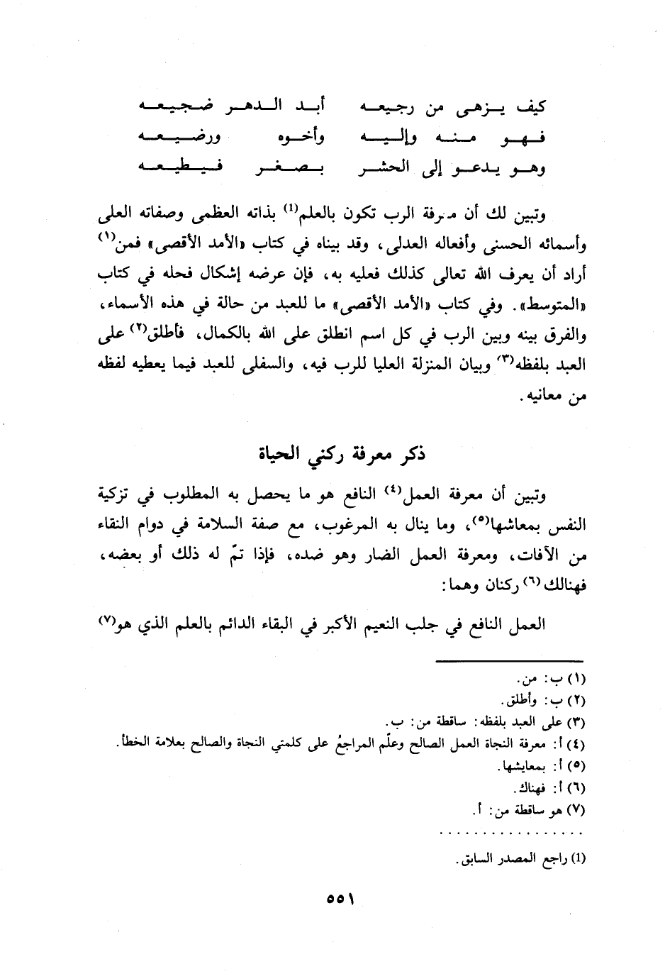 وتبين أن معرفة العمل النافع هو ما يحصل به المطلوب في تزكية النفس بمعاشها، وما ينال به المرغوب، مع صفة السلامة في دوام النقاء من الآفات، ومعرفة العمل الضار وهو ضده، فإذا تمّ له ذلك أو بعضه، فهنالك ركنان وهما:
