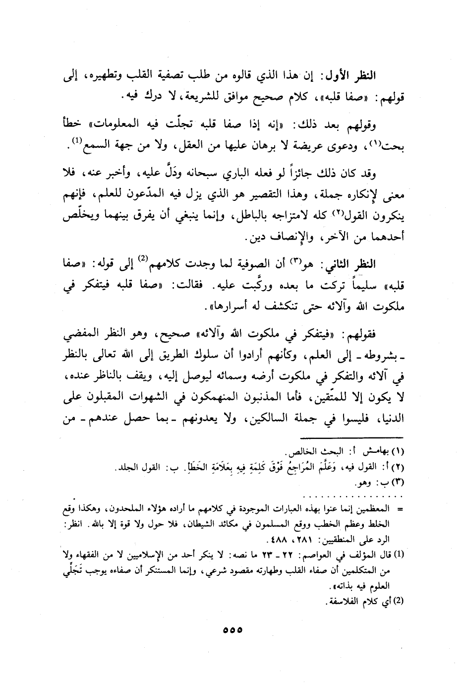 (¬1) قال المؤلف في العواصم: 22 - 23 ما نصه: لا ينكر أحد من الإِسلاميين لا من الفقهاء ولا من المتكلمين أن صفاء القلب وطهارته مقصود شرعي، وإنما المستنكر أن صفاءه يوجب تَجَلي العلوم فيه بذاته".