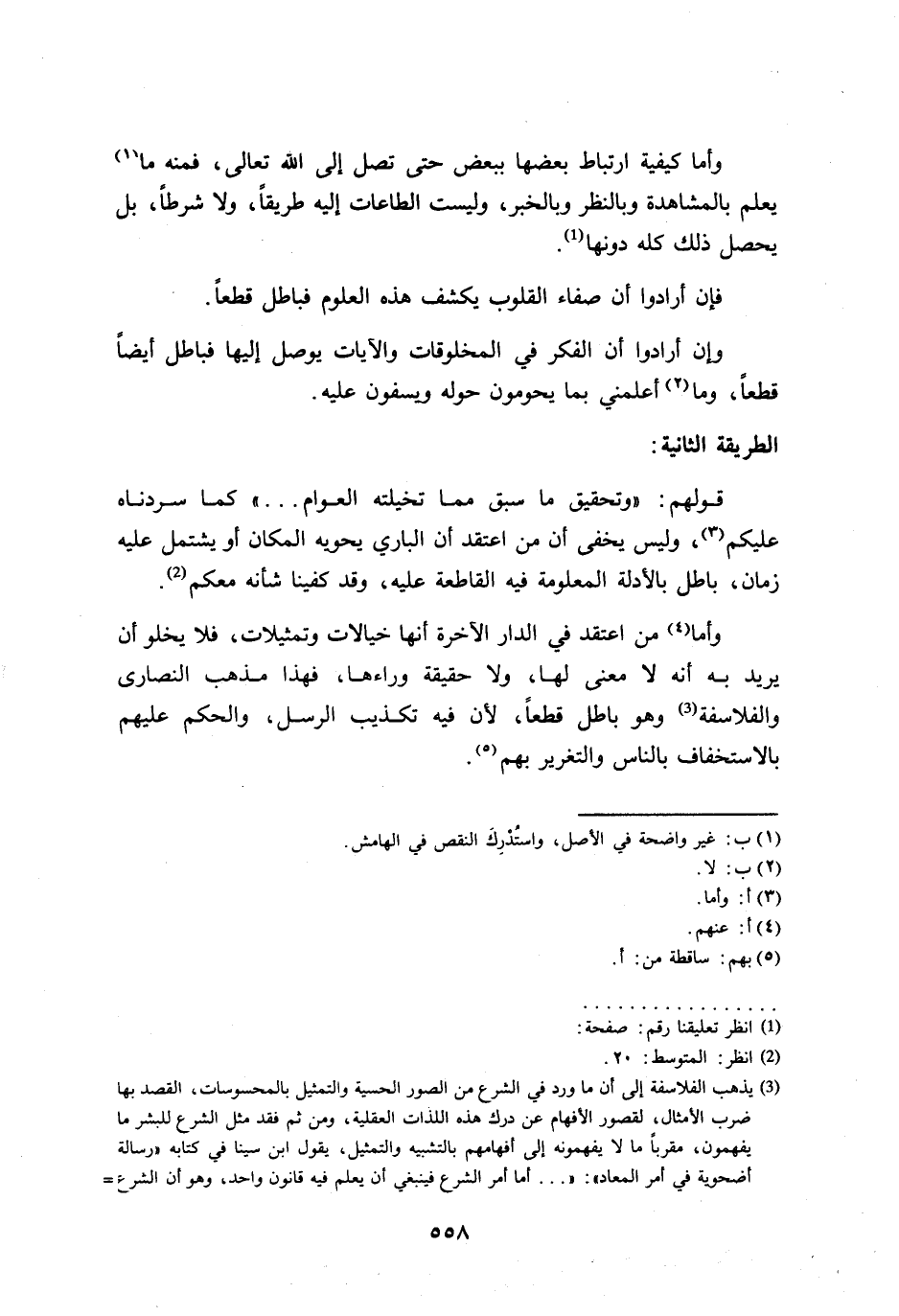 قولهم: "وتحقيق ما سبق مما تخيلته العوام ... " كما سردناه عليكم، وليس يخفى أن من اعتقد أن الباري يحويه المكان أو يشتمل عليه زمان، باطل بالأدلة المعلومة فيه القاطعة عليه، وقد كفينا شأنه معكم (¬2).