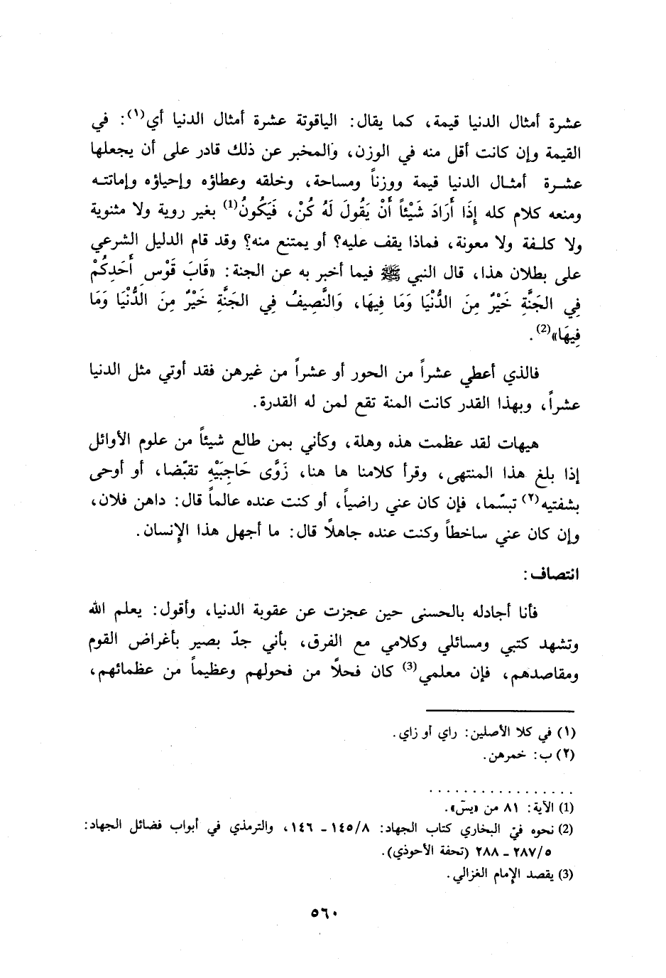 عشرة أمثال الدنيا قيمة، كما يقال: الياقوتة عشرة أمثال الدنيا أي: في القيمة وإن كانت أقل منه في الوزن، والمخبر عن ذلك قادر على أن يجعلها عشرة أمثال الدنيا قيمة ووزناً ومساحة، وخلقه وعطاؤه وإحياؤه وإماتته ومنعه كلام كله إِذَا أرَادَ شَيْئاً أنْ يَقُولَ لَهُ كُنْ، فَيَكُونُ (¬1) بغير روية ولا مثنوية ولا كلفة ولا معونة، فماذا يقف عليه؟ أو يمتنع منه؟ وقد قام الدليل الشرعي على بطلان هذا، قال النبي - صلى الله عليه وسلم - فيما أخبر به عن الجنة: "قَابَ قَوْس أحَدِكُمْ في الجَنةِ خَيْرٌ مِنَ الدُّنْيَا وَمَا فِيهَا، وَالنَّصِيفُ في الجَنَّةِ خَيْرٌ مِنَ الَدُّنْيَا وَمَا فِيهَا" (¬2).