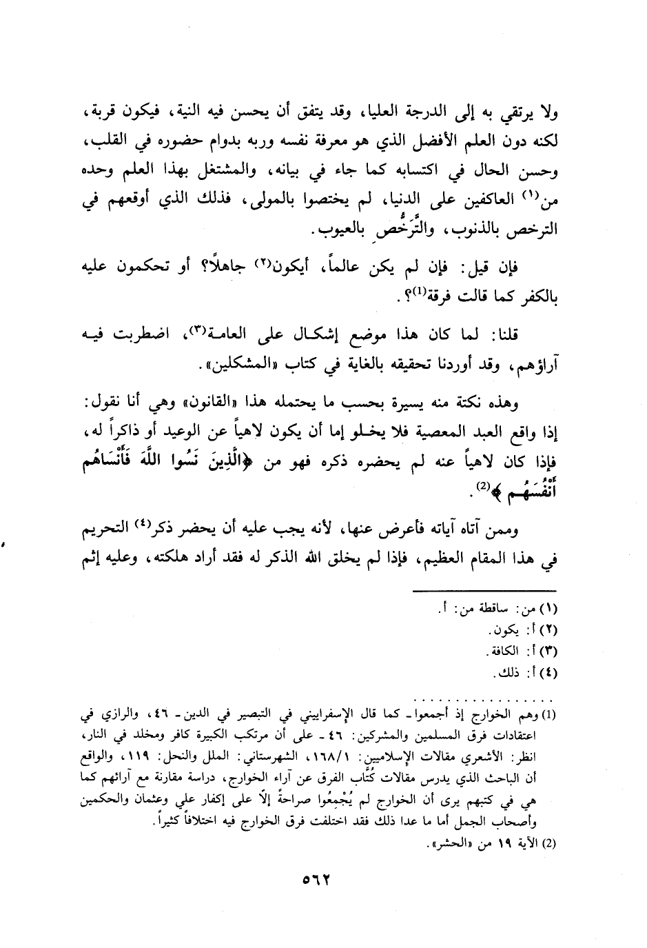 ولا يرتقي به إلى الدرجة العليا، وقد يتفق أن يحسن فيه النية، فيكون قربة، لكنه دون العلم الأفضل الذي هو معرفة نفسه وربه بدوام حضوره في القلب، وحسن الحال في اكتسابه كما جاء في بيانه، والمشتغل بهذا العلم وحده من العاكفين على الدنيا، لم يختصوا بالمولى، فذلك الذي أوقعهم في الترخص بالذنوب، والتَّرَخُّصِ بالعيوب.