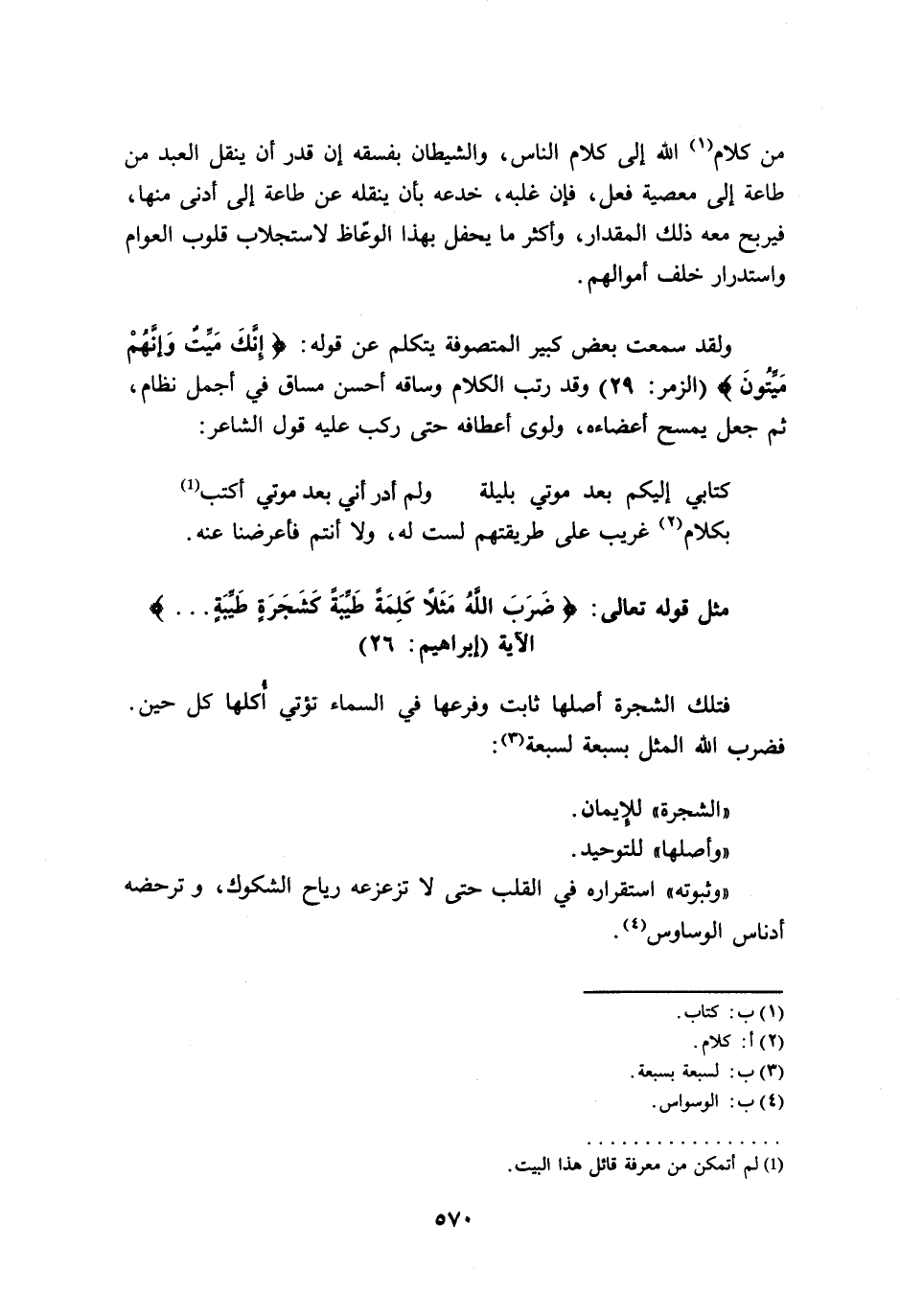 ولقد سمعت بعض كبير المتصوفة يتكلم عن قوله: {إِنَّكَ مَيِّتٌ وَإِنَّهُمْ مَيِّتُونَ} [الزمر: 30] وقد رتب الكلام وساقه أحسن مساق في أجمل نظام، ثم جعل يمسح أعضاءه، ولوى أعطافه حتى ركب عليه قول الشاعر: