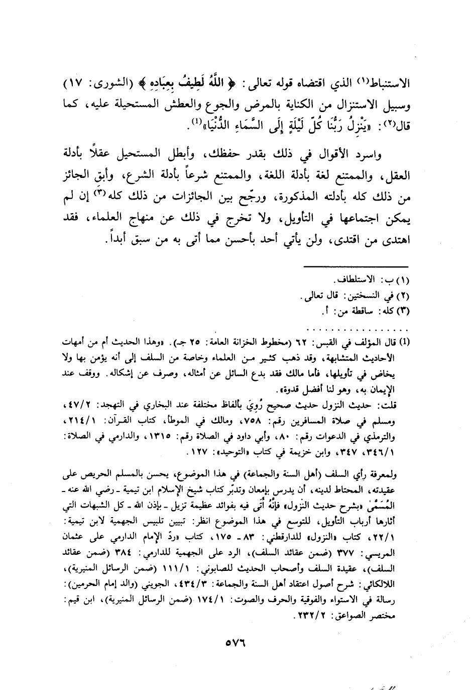 قلت: حديث النزول حديث صحيح رُوِيَ بألفاظ مختلفة عند البخاري في التهجد: 2/ 47، ومسلم في صلاة المسافرين رقم: 758، ومالك في الموطأ كتاب القرآن: 1/ 214، والترمذي في الدعوات رقم: 80، وأبي داود في الصلاة رقم: 1315، والدارمي في الصلاة: 1/ 346،347، وابن خزيمة في كتاب "التوحيد": 127.