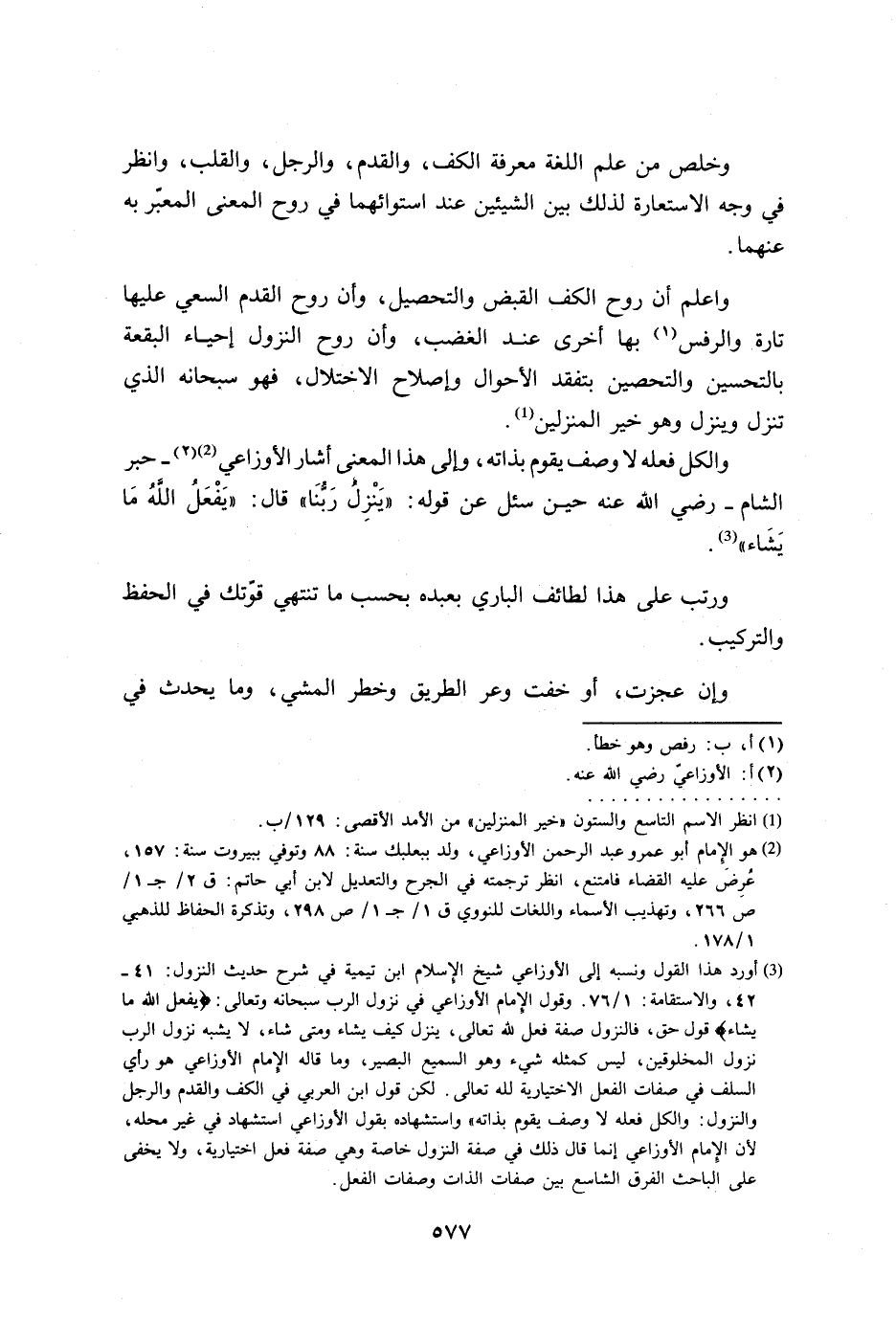 (¬3) أورد هذا القول ونسبه إلى الأوزاعي شيخ الإسلام ابن تيمية في شرح حديث النزول: 41 - 42، والاستقامة: 1/ 76. وقول الإِمام الأوزاعي في نزول الرب سبحانه وتعالى: {وَيَفْعَلُ اللَّهُ مَا يَشَاءُ} قول حق، فالنزول صفة فعل لله تعالى، ينزل كيف يشاء ومتى شاء، لا يشبه نزول الرب نزول المخلوقين، ليس كمثله شيء وهو السميع البصير، وما قاله الإِمام الأوزاعي هو رأي السلف في صفات الفعل الاختيارية لله تعالى. لكن قول ابن العربي في الكف والقدم والرجل والنزول: والكل فعله لا وصف يقوم بذاته" واستشهاده بقول الأوزاعي استشهاد في غير محله، لأن الِإمام الأوزاعي إنما قال ذلك في صفة النزول خاصة وهي صفة فعل اختيارية، ولا يخفى على الباحث الفرق الشاسع بين صفات الذات وصفات الفعل.