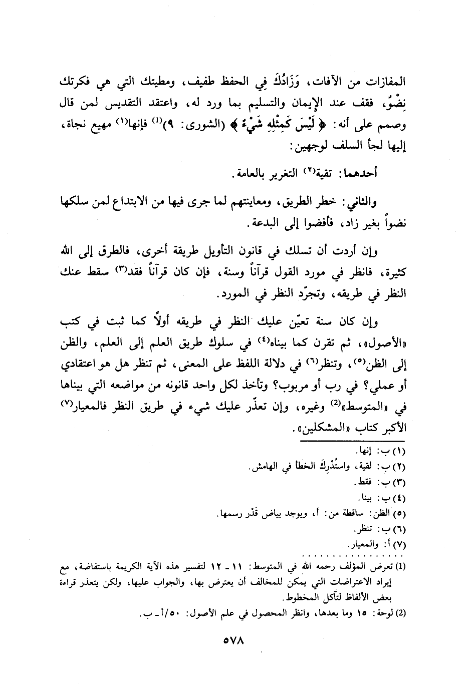 المفازات من الآفات، وَزَادُكَ في الحفظ طفيف، ومطيتك التي هي فكرتك نِضْوٌ، فقف عند الإيمان والتسليم بما ورد له، واعتقد التقديس لمن قال وصمم على أنه: {لَيْسَ كَمِثْلِهِ شَيْءٌ} [الشورى: 11] (¬1) فإنها مهيع نجاة، إليها لجأ السلف لوجهين: