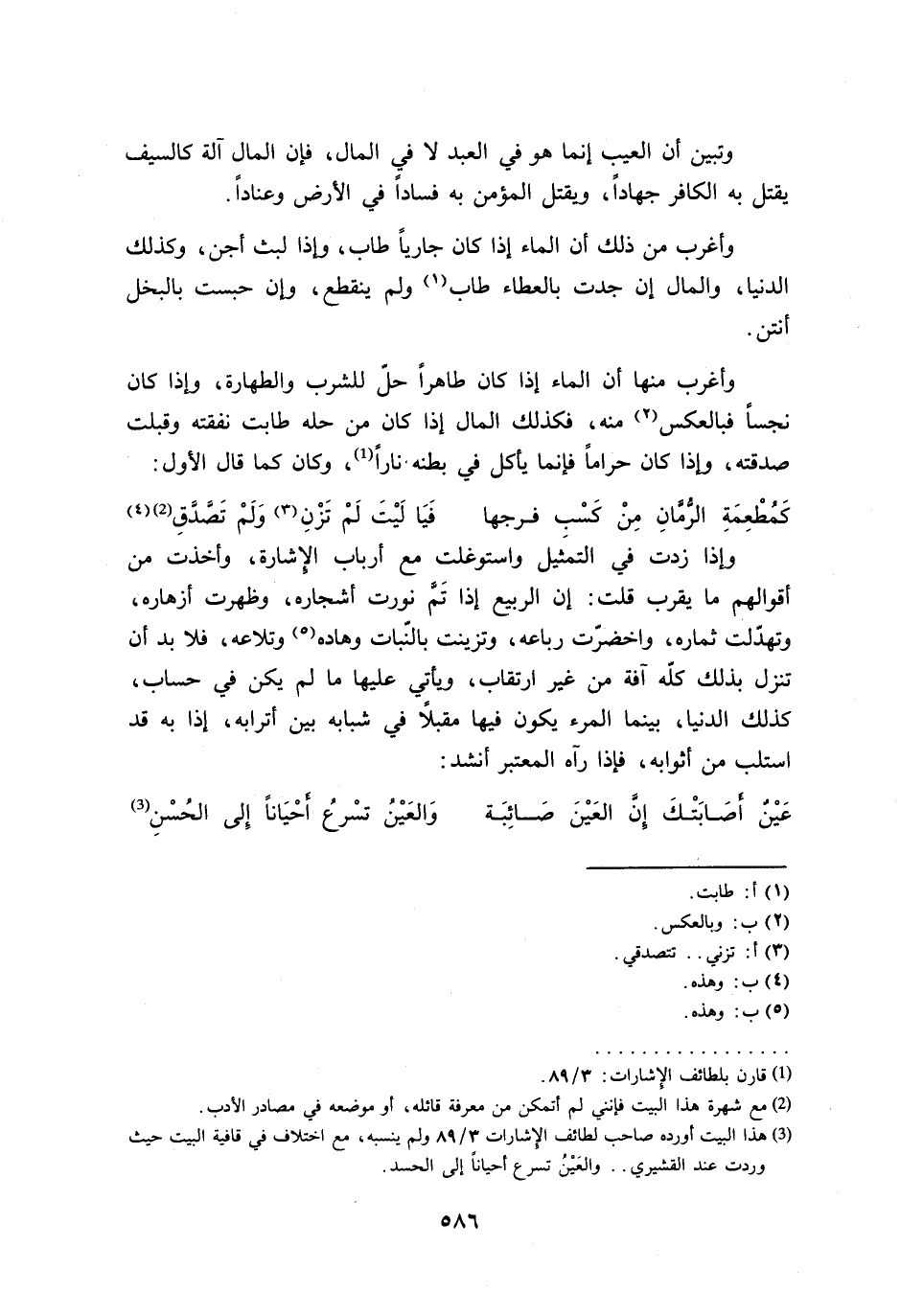 (¬3) هذا البيت أورده صاحب لطائف الإشارات 3/ 89 ولم ينسبه، مع اختلاف في قافية البيت حيث وردت عند القشيري .. والعَيْنُ تسرع أحياناً إلى الحسد.