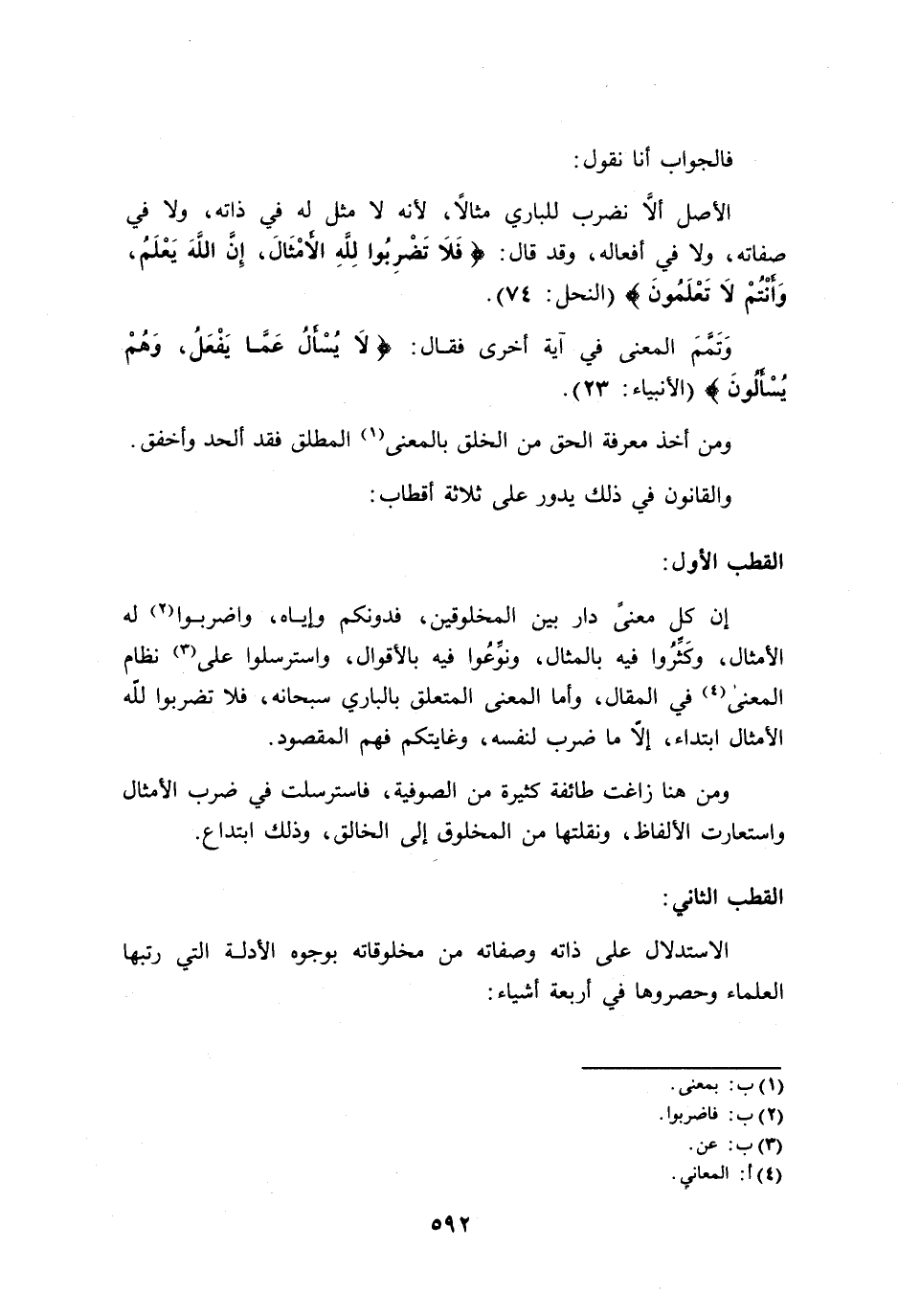 إن كل معنىً دار بين المخلوقين، فدونكم وإياه، واضربوا له الأمثال، وكَثَّرُوا فيه بالمثال، ونوِّعُوا فيه بالأقوال، واسترسلوا على نظام المعنى في المقال، وأما المعنى المتعلق بالباري سبحانه، فلا تضربوا لله الأمثال ابتداء، إلاَّ ما ضرب لنفسه، وغايتكم فهم المقصود.