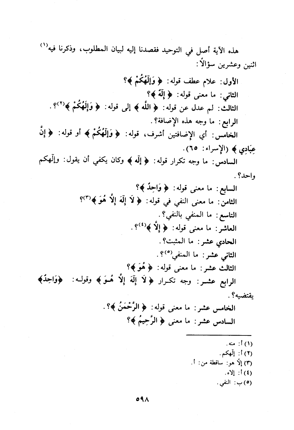 هذه الآية أصل في التوحيد فقصدنا إليه لبيان المطلوب، وذكرنا فيه اثنين وعشرين سؤالاً: