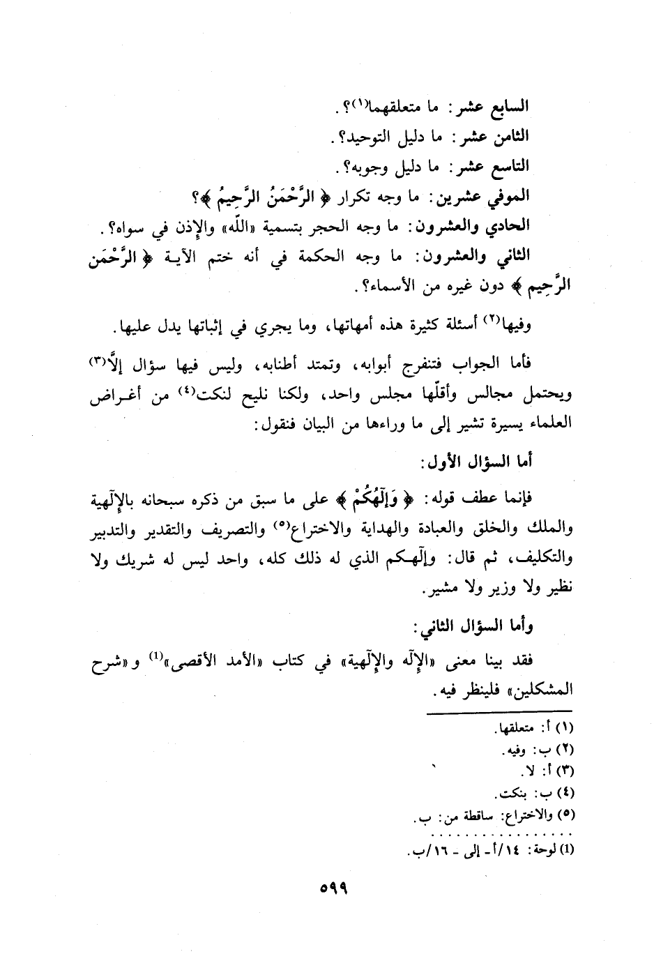 فأما الجواب فتنفرج أبوابه، وتمتد أطنابه، وليس فيها سؤال إلاَّ ويحتمل مجالس وأقلّها مجلس واحد، ولكنا نليح لنكت من أغراض العلماء يسيرة تشير إلى ما وراءها من البيان فنقول: