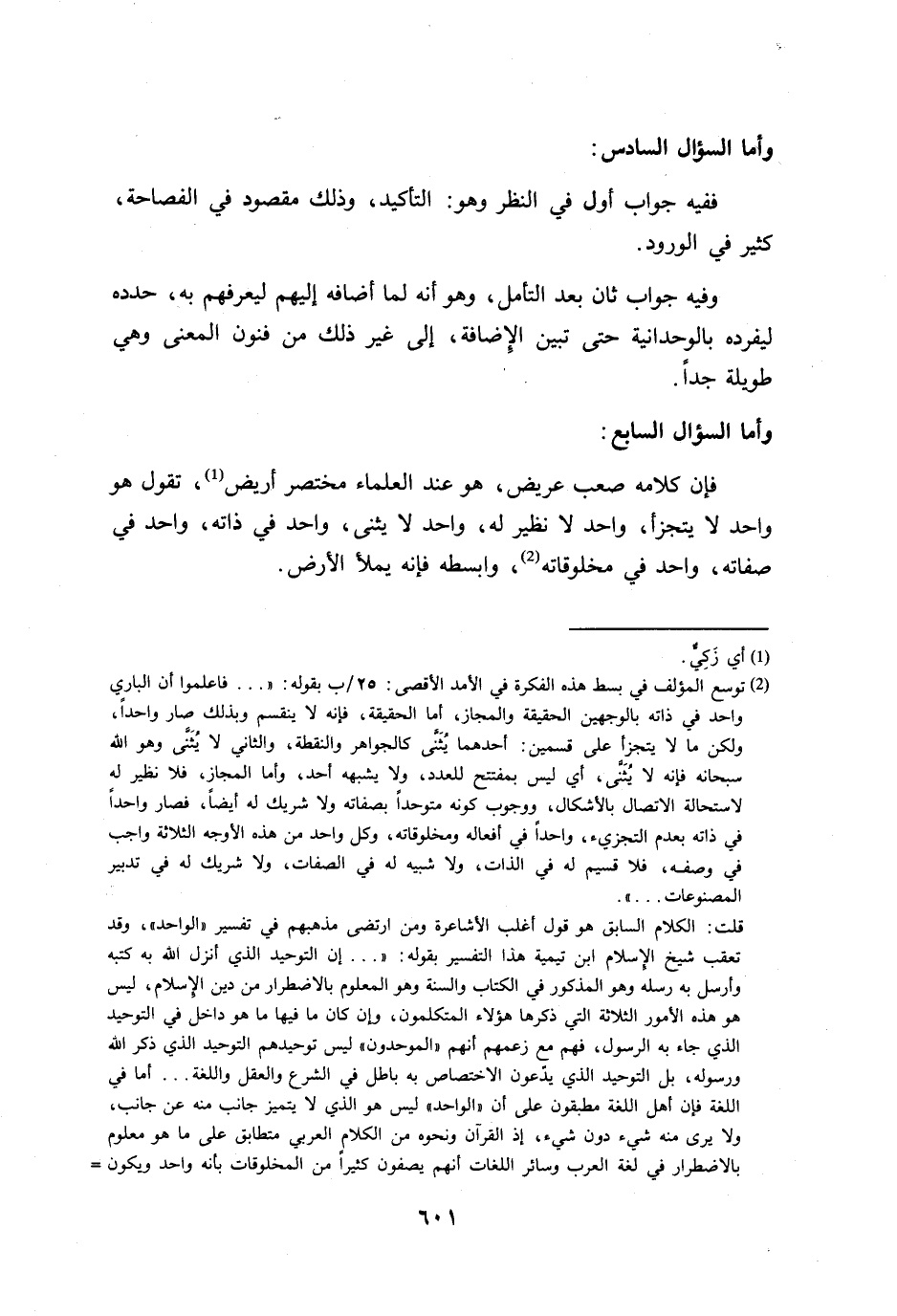 (¬2) توسع المؤلف في بسط هذه الفكرة في الأمد الأقصى: 25/ ب بقوله: " ... فاعلموا أن الباري واحد في ذاته بالوجهين الحقيقة والمجاز، أما الحقيقة، فإنه لا ينقسم وبذلك صار واحداً، ولكن ما لا يتجزأ على قسمين: أحدهما يُثَنَّى كالجواهر والنقطة، والثاني لا يُثَنَّى وهو الله سبحانه فإنه لا يُثَنى، أي ليس بمفتتح للعدد، ولا يشبهه أحد، وأما المجاز، فلا نظير له لاستحالة الاتصال بالأشكال، ووجوب كونه متوحداً بصفاته ولا شريك له أيضاً فصار واحداً في ذاته بعدم التجزيء، واحداً في أفعاله ومخلوقاته، وكل واحد من هذه الأوجه الثلاثة واجب في وصفه، فلا قسيم له في الذات، ولا شبيه له في الصفات، ولا شريك له في تدبير المصنوعات ... ".