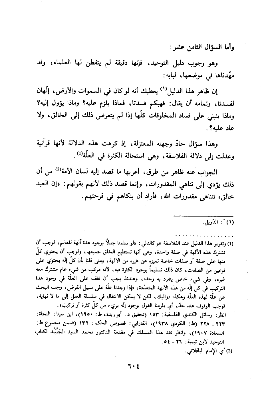 (¬1) وتقرير هذا الدليل عند الفلاسفة هو كالتالي: "لو سلمنا جدلاً بوجود عدة آلهة للعالم، لوجب أن تشترك هذه الألهة في صفة واحدة، وهي أنها تستطيع الخلق جميعها، ولوجب أن يحتوي كل منها على صفة أو صفات خاصة تميزه عن غيره من الآلهة، ومتى قلنا بأن كل إله يحتوي على نوعين من الصفات، كان ذلك تسليماً بوجود الكثرة فيه، لأنه مركب من شيء عام مشترك معه غيره، وفي شيء خاص ينفرد به وحده، وعندئذ يجب أن نقف على العلة في وجود هذا التركيب في كل إله من هذه الألهة المتعددة، فإذا وجدنا علة على سبيل الفرض، وجب البحث عن علة لهذه العلة وهكذا دواليك، لكن لا يمكن الانتقال في سلسلة العلل إلى ما لا نهاية، فوجب الوقوف عند حدّ، أي يلزمنا القول بوجود الله بريء من كل كثرة أو تركيب".
