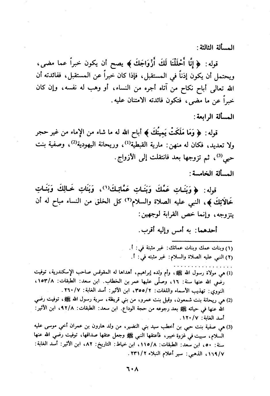 (¬3) هي صفية بنت حيي بن أخطب سيد بني النضير، من ولد هارون بن عمران أخي موسى عليه السلام، سبيت في غزوة خيبر، فأعتقها النبي - صلى الله عليه وسلم - وجعل عتقها صداقها، توفيت رضي الله عنها سنة: 50، ابن سعد: الطبقات: 8/ 115، ابن خياط: التاريخ: 82، ابن الأثير: أسد الغابة: 7/ 169، الذهبي: سير أعلام النبلاء 2/ 231.