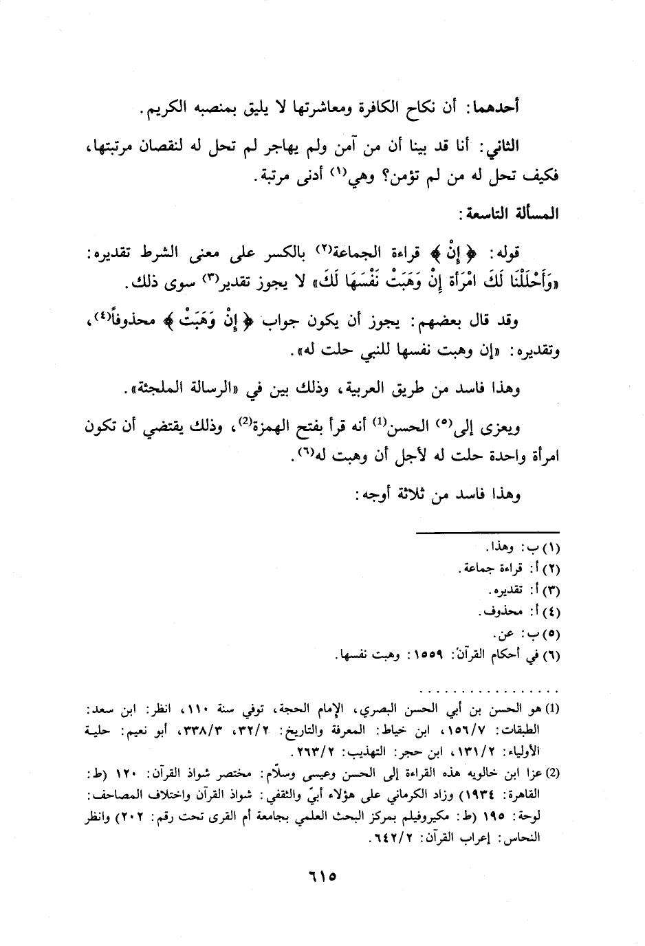 (¬2) عزا ابن خالويه هذه القراءة إلى الحسن وعيسى وسلاّم: مختصر شواذ القرآن: 120 (ط: القاهرة: 1934) وزاد الكرماني على هؤلاء أبيّ والثقفي: شواذ القرآن واختلاف المصاحف: لوحة: 195 (ط: مكيروفيلم بمركز البحث العلمي بجامعة أم القرى تحت رقم: 202) وانظر النحاس: إعراب القرآن: 2/ 642.