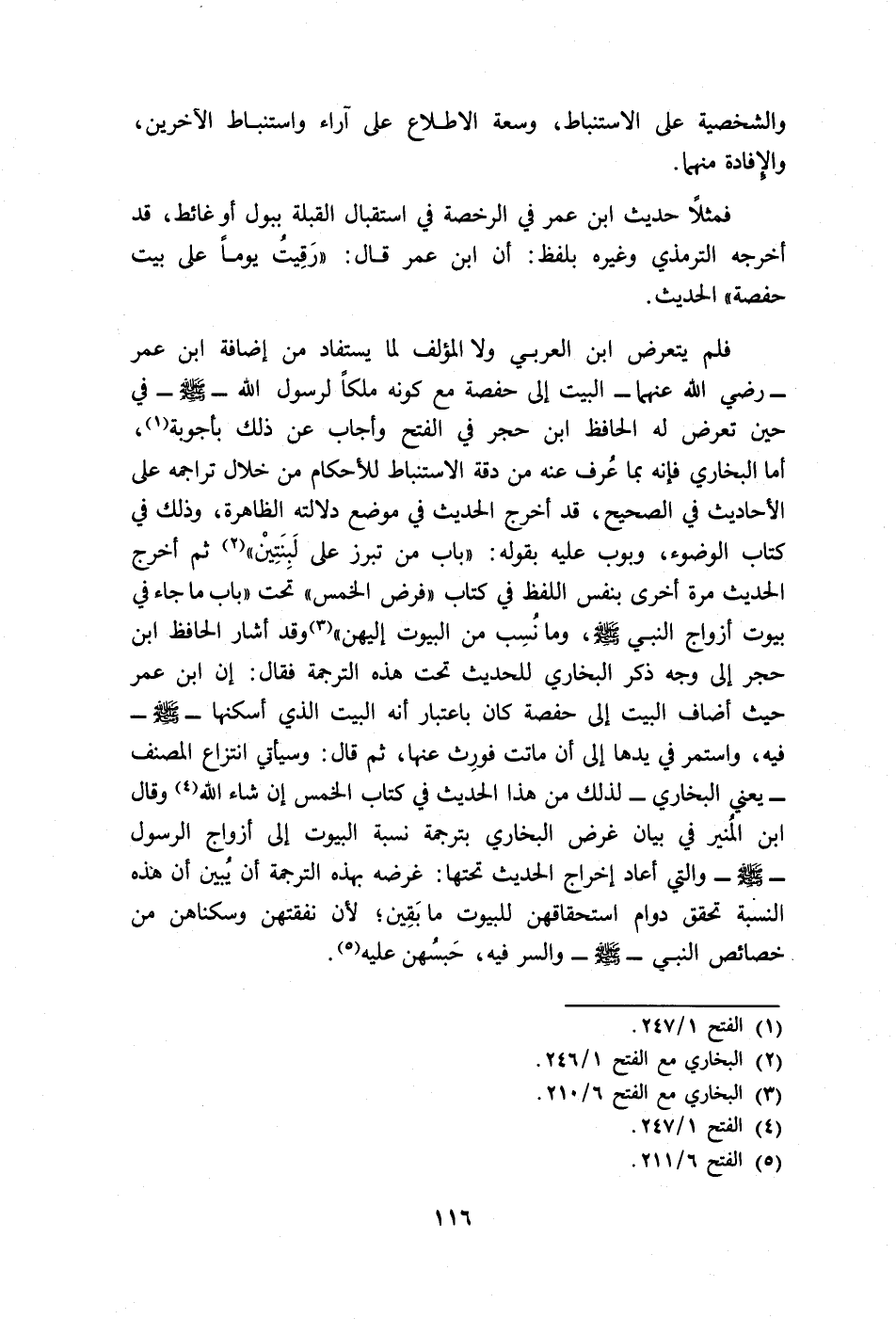 فلم يتعرض ابن العربي ولا المؤلف لما يستفاد من إضافة ابن عمر -رضي الله عنهما- البيت إلى حفصة مع كونه ملكًا لرسول الله- صلى الله عليه وسلم- في حين تعرض له الحافظ ابن حجر في الفتح وأجاب عن ذلك بأجوبة (¬1)، أما البخاري فإنه بما عُرف عنه من دقة الاستنباط للأحكام من خلال تراجمه على الأحاديث في الصحيح، قد أخرج الحديث في موضع دلالته الظاهرة، وذلك في كتاب الوضوء، وبوب عليه بقوله: "باب من تبرز على لَبِنَتِينْ" (¬2) ثم أخرج الحديث مرة أخرى بنفس اللفظ في كتاب "فرض الخمس" تحت "باب ما جاء في بيوت أزواج النبي -صلى الله عليه وسلم-، وما نُسِب من البيوت إليهن" (¬3) وقد أشار الحافظ ابن حجر إلى وجه ذكر البخاري للحديث تحت هذه الترجمة فقال: إن ابن عمر حيث أضاف البيت إلى حفصة كان باعتبار أنه البيت الذي أسكنها -صلى الله عليه وسلم- فيه، واستمر في يدها إلى أن ماتت فورِث عنها، ثم قال: وسيأتي انتزاع المصنف -يعني البخاري- لذلك من هذا الحديث في كتاب الخمس إن شاء الله (¬4) وقال ابن المُنير في بيان غرض البخاري بترجمة نسبة البيوت إلى أزواج الرسول -صلى الله عليه وسلم- والتي أعاد إخراج الحديث تحتها: غرضه بهذه الترجمة أن يُبين أن هذه النسبة تحقق دوام استحقاقهن للبيوت ما بَقِين؛ لأن نفقتهن وسكناهن من خصائص النبي-صلى الله عليه وسلم- والسر فيه، حَبسُهن عليه (¬5).