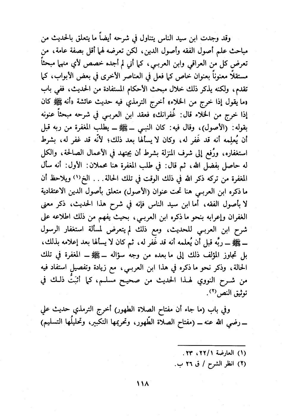 وقد وجدت ابن سيد الناس يتناول في شرحه أيضًا ما يتعلق بالحديث من مباحث علم أصول الفقه وأصول الدين، لكن تعرضه لهما أقل بصفة عامة، من تعرض كل من العراقي وابن العربي، كما أني لم أجده خصص لأي منهما مبحثًا مستقلًا معنونًا بعنوان خاص كما فعل في العناصر الأخرى في بعض الأبواب، كما تقدم، ولكنه يذكر ذلك خلال مبحث الأحكام المستفادة من الحديث، ففي باب "ما يقول إذا خرج من الخلاء" أخرج الترمذي فيه حديث عائشة "أنه -صلى الله عليه وسلم- كان إذا خرج من الخلاء قال: غُفرانك" فعقد ابن العربي في شرحه مبحثًا عنونه بقوله: (الأصول)، وقال فيه: كان النبي -صلى الله عليه وسلم- يطلب المغفرة من ربه قبل أن يُعلِمه أنه قد غَفر له، وكان لايسألها بعد ذلك؛ لأنه قد غفر له، بشرط استغفاره، ورُفع إلى شرف المنزلة بشرط أن يجتهد في الأعمال الصالحة، والكل له حاصل بفضل الله، ثم قال: في طلب المغفرة هنا محملان: الأول: أنه سأل المغفرة من تركه ذكر الله في ذلك الوقت في تلك الحالة ... الخ (¬1) ويلاحظ أن ما ذكره ابن العربي هنا تحت عنوان (الأصول) متعلق بأصول الدين الاعتقادية لا بأصول الفقه، أما ابن سيد الناس فإنه في شرح هذا الحديث، ذكر معنى الغفران وإعرابه بنحو ما ذكره ابن العربي، بحيث يفهم من ذلك اطلاعه على شرح ابن العربي للحديث، ومع ذلك لم يتعرض لمسألة استغفار الرسول -صلى الله عليه وسلم- ربَّه قبل أن يُعلمه أنه قد غفر له، ثم كان لا يسألها بعد إعلامه بذلك، بل تجاوز المؤلف ذلك إلى ما بعده من وجه سؤاله -صلى الله عليه وسلم- المغفرة في تلك الحالة، وذكر نحو ما ذكره في هذا ابن العربي، مع زيادة وتفصيل استفاد فيه من شرح النووي لهذا الحديث من صحيح مسلم، كما أثبَتُّ ذلك في توثيق النص (¬2).