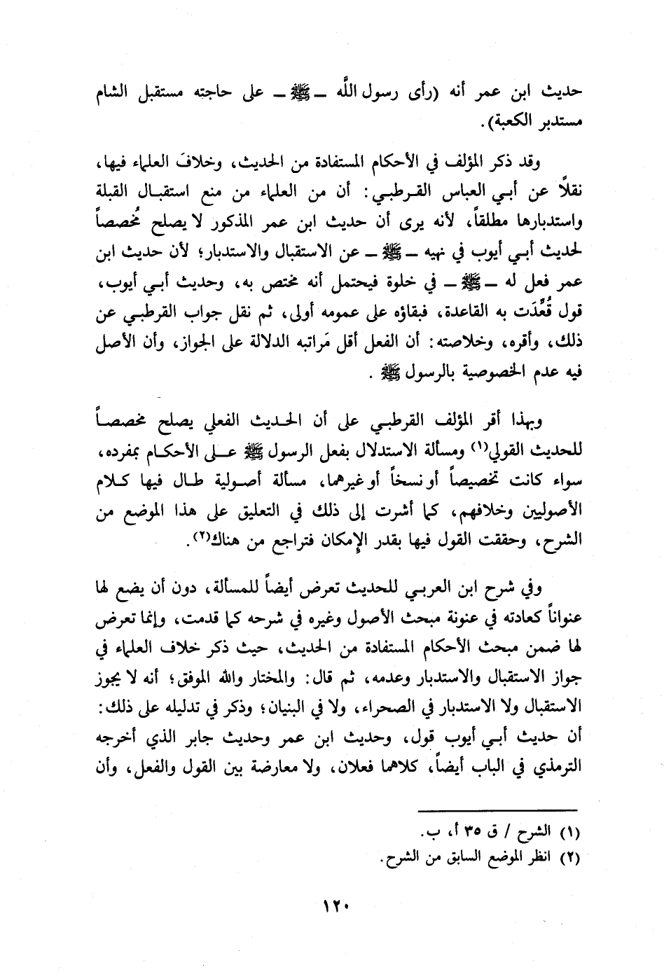 وقد ذكر المؤلف في الأحكام المستفادة من الحديث، وخلافَ العلماء فيها، نقلًا عن أبي العباس القرطبي: أن من العلماء من منع استقبال القبلة واستدبارها مطلقًا، لأنه يرى أن حديث ابن عمر المذكور لا يصلح مُخصصًا لحديث أبي أيوب في نهيه -صلى الله عليه وسلم- عن الاستقبال والاستدبار؛ لأن حديث ابن عمر فعل له -صلى الله عليه وسلم- في خلوة فيحتمل أنه مختص به، وحديث أبي أيوب، قول قُعِّدَت به القاعدة، فبقاؤه على عمومه أولى، ثم نقل جواب القرطبي عن ذلك، وأقره، وخلاصته: أن الفعل أقل مَراتبه الدلالة على الجواز، وأن الأصل فيه عدم الخصوصية بالرسول -صلى الله عليه وسلم-.
