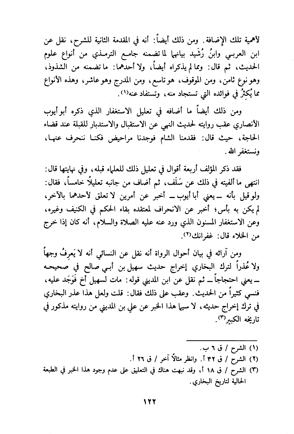 لأهمية تلك الإِضافة. ومن ذلك أيضًا: أنه في المقدمة الثانية للشرح، نقل عن ابن العربي وابنُ رُشَيد بيانهما لما تضمنه جامع الترمذي من أنواع علوم الحديث، ثم قال: ومما لم يذكراه أيضًا، ولا أحدهما: ما تضمنه من الشذوذ، وهو نوع ثامن، ومن الموقوف، هو تاسع، ومن المدرج وهو عاشر، وهذه الأنواع مما يُكِثرُ في فوائده التي تستجاد منه، وتستفاد عنه (¬1).