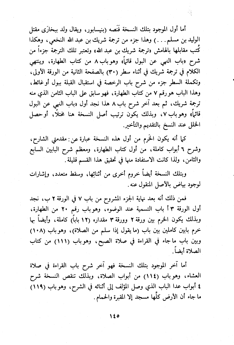 أما أول الموجود بتلك النسخة فَنَصه (بنيسابور، ويقال ولد ببخارَى مقتل الوليد بن مسلم ...) وهذا جزء من ترجمة شريك بن عبد الله النخعي، وهكذا كُتب مقابلها بالهامش "ترجمة شريك بن عبد الله" وتعتبر تلك الترجمة جزءًا من شرح "باب النهي عن البول قائمًا" وهو باب 8 من كتاب الطهارة، وينتهي الكلام في ترجمة شريك في أثناء سطر (30) بالصفحة الثانية من الورقة الأولى، وتكملة السطر جزء من شرح باب الرخصة في استقبال القبلة ببول أو غائط، وهذا الباب هو رقم 7 من كتاب الطهارة، فهو سابق على الباب الثامن الذي منه ترجمة شريك، ثم بعد آخر شرح باب 8 هذا نجد أول "باب النهي عن البول قائمًا" وهو باب 7، وبذلك يكون ترتيب أصل النسخة هنا مختلًا، أو حصل الخلل عند النسخ بالتقديم والتأخير.