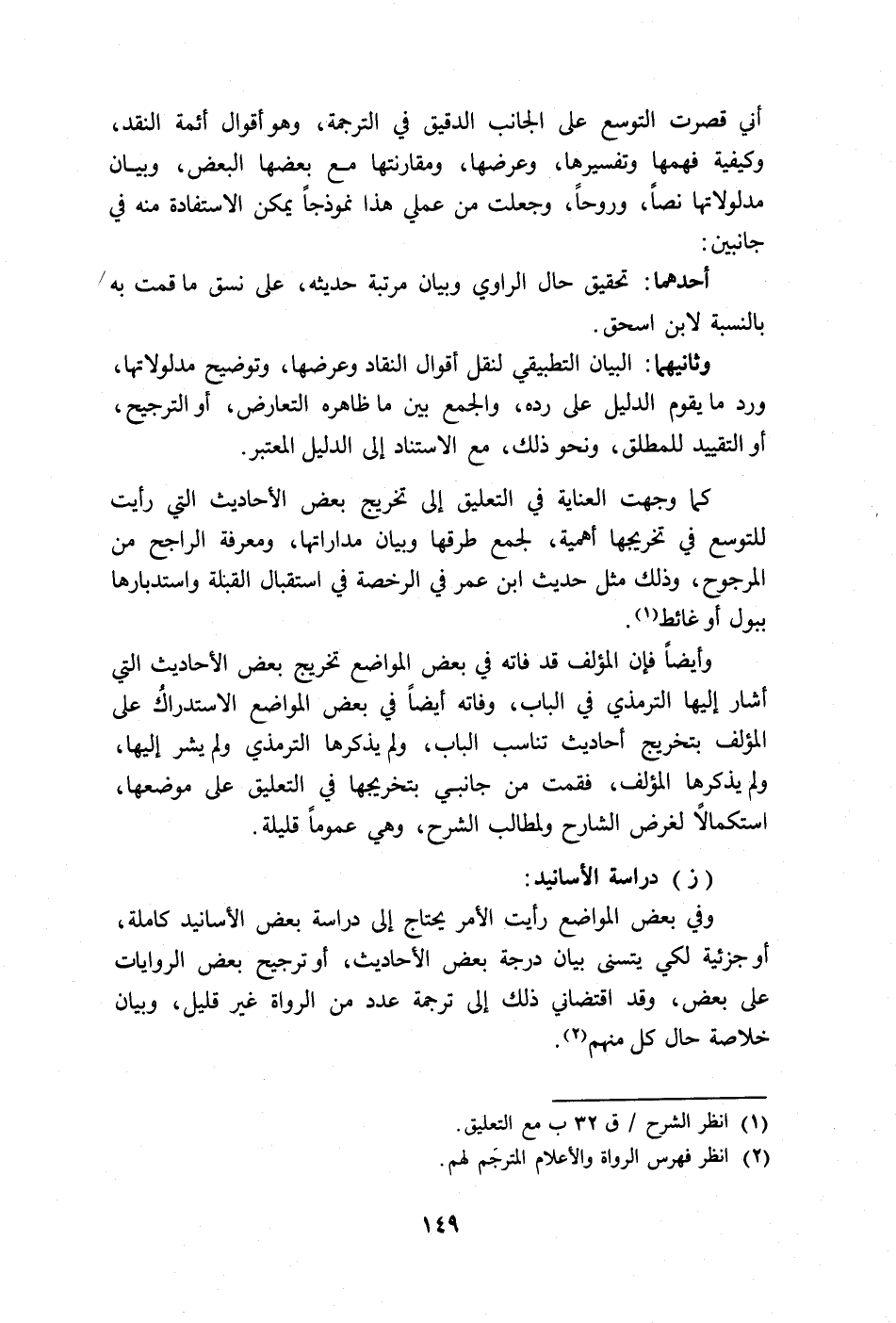 وفي بعض المواضع رأيت الأمر يحتاج إلى دراسة بعض الأسانيد كاملة، أو جزئية لكي يتسنى بيان درجة بعض الأحاديث، أو ترجيح بعض الروايات على بعض، وقد اقتضاني ذلك إلى ترجمة عدد من الرواة غير قليل، وبيان خلاصة حال كل منهم (¬2).