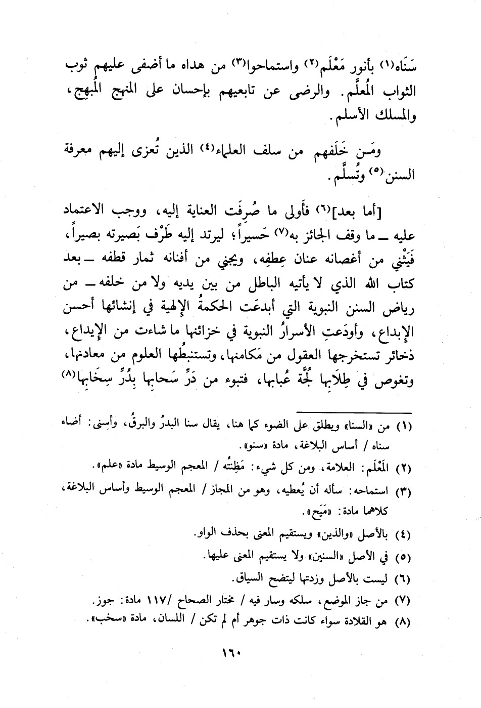 [أما بعد] (¬6) فأَولى ما صُرِفَت العناية إليه، ووجب الاعتماد عليه - ما وقف الجائز به (¬7) حَسيرًا؛ ليرتد إليه طَرْف بَصيرته بصيرًا، فَيَثْني من أغصانه عنان عِطفِه، ويجني من أفنانه ثمار قطفه -بعد كتاب الله الذي لا يأتيه الباطل من بين يديه ولا من خلفه- من رياض السنن النبوية التي أبدعَت الحكمةُ الإِلهية في إنشائها أحسن الإِبداع، وأودَعتِ الأسرارُ النبوية في خزائنها ما شاءت من الإيداع، ذخائر تستخرجها العقول من مَكامنها، وتستنبطُها العلوم من معادنها، وتغوص في طِلَابِها لُجَّة عُبابها، فتبوء من دَرِّ سَحابِها بِدُرِّ سِخَابِها (¬8)