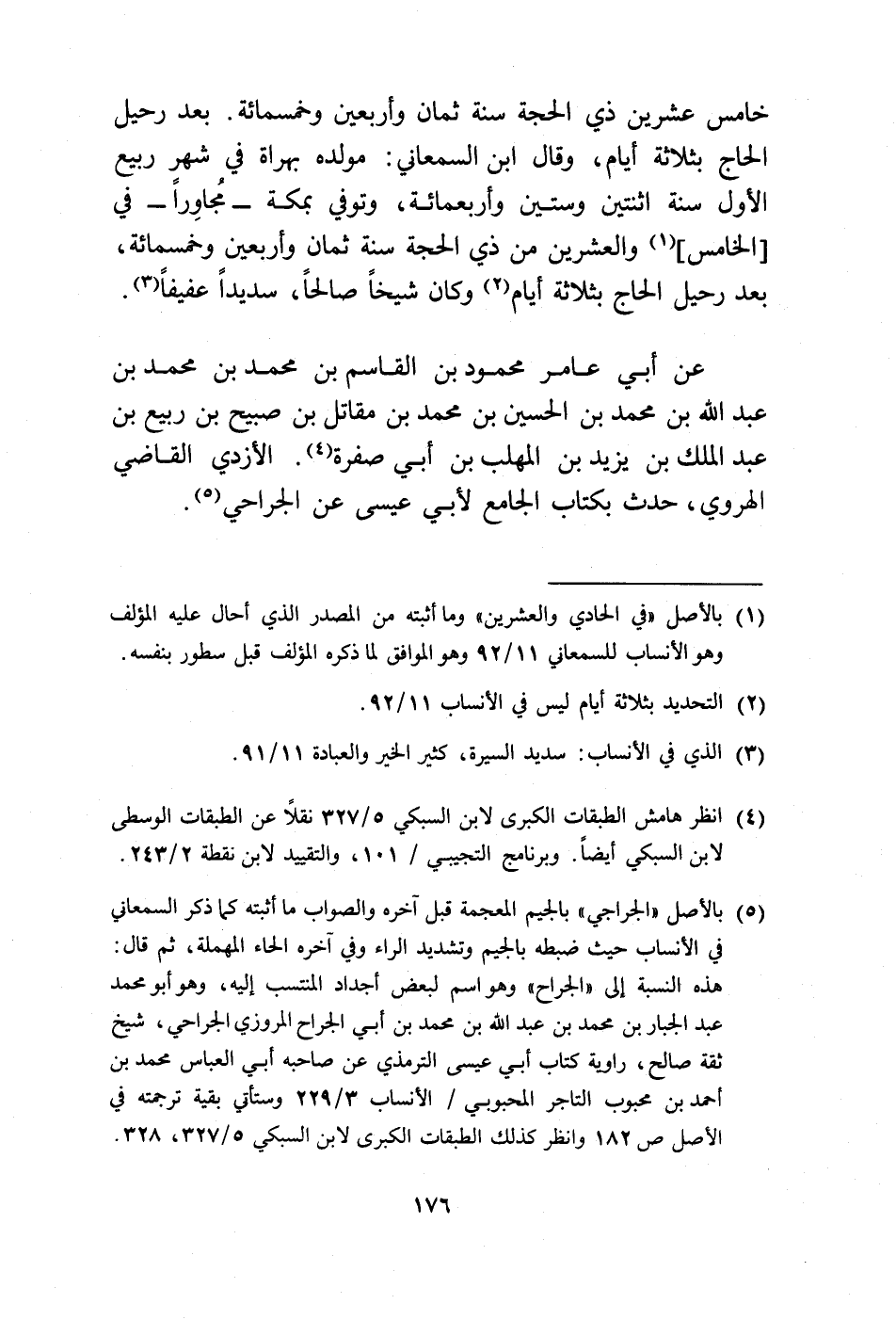 (¬5) بالأصل "الجراجي" بالجيم المعجمة قبل آخره والصواب ما أثبته كما ذكر السمعاني في الأنساب حيث ضبطه بالجيم وتشديد الراء وفي آخره الحاء المهملة، ثم قال: هذه النسبة إلى "الجراح" وهو اسم لبعض أجداد المنتسب إليه، وهو أبو محمد عبد الجبار بن محمد بن عبد الله بن محمد بن أبي الجراح المروزي الجراحي، شح ثقة صالح، راوية كتاب أبي عيسى الترمذي عن صاحبه أبي العباس محمد بن أحمد بن محبوب التاجر المحبوبي/ الأنساب 3/ 229 وستأتي بقية ترجمته في الأصل ص 182 وانظر كذلك الطبقات الكبرى لابن السبكي 5/ 327، 328.