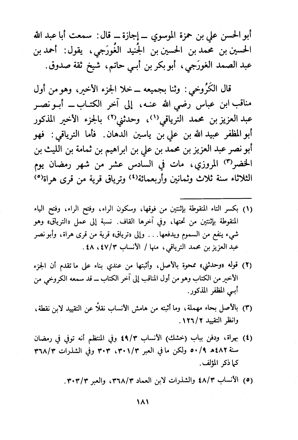 قال الكَرُوخي: وثنا بجميعه -خلا الجزء الأخير، وهو من أول مناقب ابن عباس رضي الله عنه، إلى آخر الكتاب- أبو نصر عبد العزيز بن محمد الترياقي (¬1)، وحدثني (¬2) بالجزء الأخير المذكور أبو المظفر عبيد الله بن علي بن ياسين الدهان. فأما الترياقي: فهو أبو نصر عبد العزيز بن محمد بن علي بن ابراهيم بن ثمامة بن الليث بن الخضر (¬3) المروزي، مات في السادس عشر من شهر رمضان يوم الثلاثاء سنة ثلاث وثمانين وأربعمائة (¬4) وترياق قرية من قرى هراة (¬5)