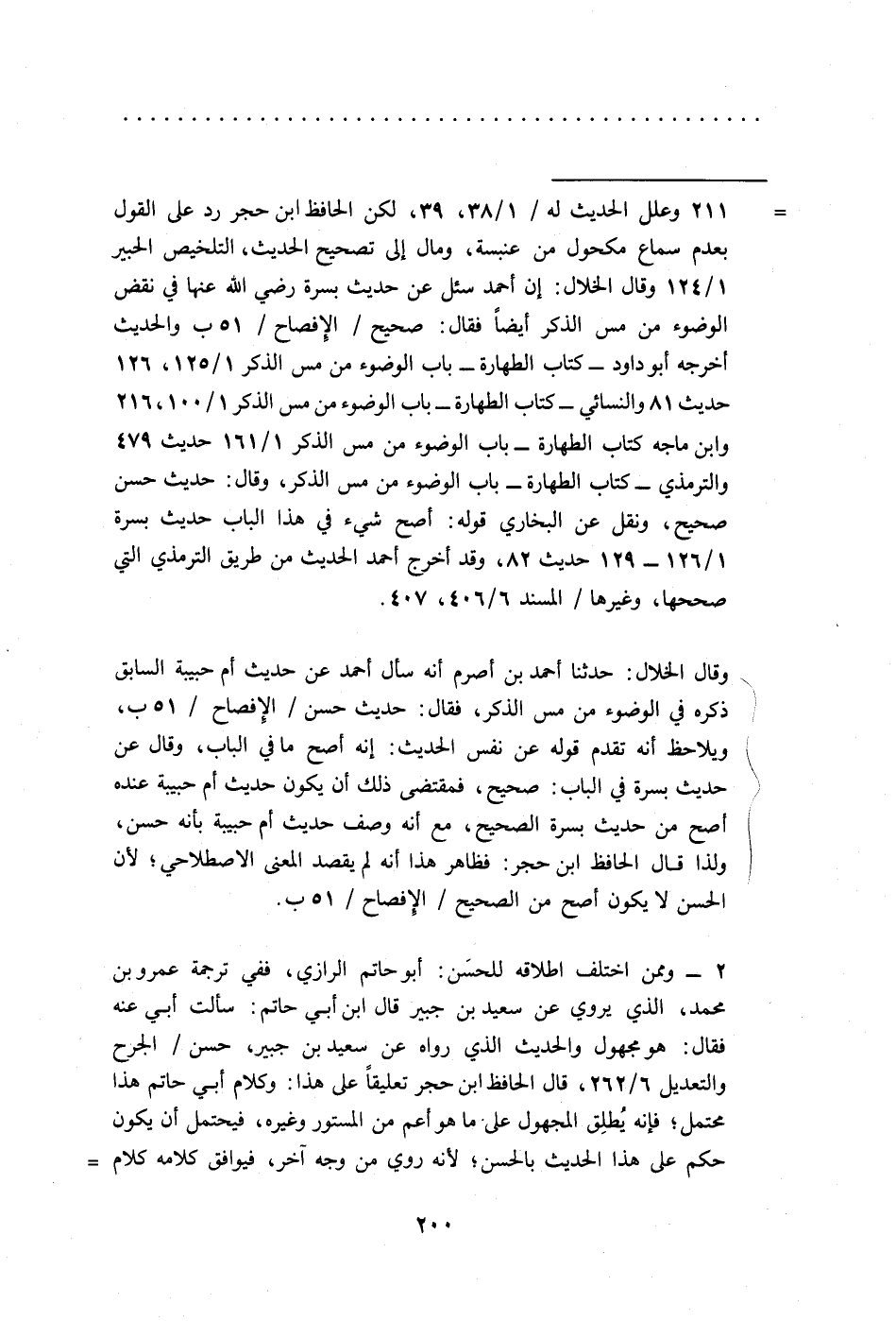 = 211 وعلل الحديث له / 1/ 38، 39، لكن الحافظ ابن حجر رد على القول بعدم سماع مكحول من عنبسة، ومال إلى تصحيح الحديث، التلخيص الحبير 1/ 124 وقال الخلال: إن أحمد سئل عن حديث بسرة رضي الله عنها في نقض الوضوء من مس الذكر أيضًا فقال: صحيح/ الإفصاح/ 51 ب والحديث أخرجه أبو داود -كتاب الطهارة- باب الوضوء من مس الذكر 1/ 125، 126 حديث 81 والنسائي -كتاب الطهارة- باب الوضوء من مس الذكر 1/ 100، 216 وابن ماجه كتاب الطهارة - باب الوضوء من مس الذكر 1/ 161 حديث 479 والترمذي -كتاب الطهارة- باب الوضوء من مس الذكر، وقال: حديث حسن صحيح، ونقل عن البخاري قوله: أصح شيء في هذا الباب حديث بسرة 1/ 126 - 129 حديث 82، وقد أخرج أحمد الحديث من طريق الترمذي التي صححها، وغيرها/ المسند 6/ 406، 407.
