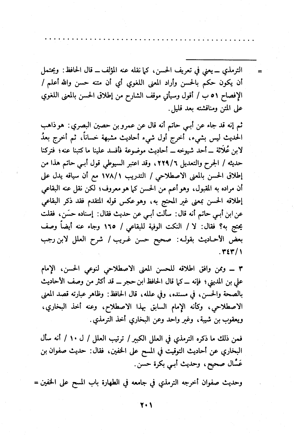 ثم إنه قد جاء عن أبي حاتم أنه قال عن عمرو بن حصين البصري: هو ذاهب الحديث ليس بشيء، أخرج أول شيء أحاديث مشبهة خسانًا، ثم أخرج بعدُ لابن عُلاَثة -أحد شيوخه- أحاديث موضوعة فأفسد علينا ما كتبنا عنه؛ فتركنا حديثه/ الجرح والتعديل 6/ 229، وقد اعتبر السيوطي قول أبي حاتم هذا من إطلاق الحسن بالمعنى الاصطلاحي/ التدريب 1/ 178 مع أن سياقه يدل على أن مراده به المقبول، وهو أعم من الحسن كما هو معروف؛ لكن نقل عنه البقاعي إطلاقه الحسن بمعنى غير المحتج به، وهوعكس قوله المتقدم فقد ذكر البقاعي عن ابن أبي حاتم أنه قال: سألت أبي عن حديث فقال: إسناده حسَن، فقلت يحتج به؟ فقال: لا/ النكت الوفية للبقاعي/ 165 وجاء عنه أيضًا وصف بعض الأحاديث بقوله: صحيح حسن غريب/ شرح العلل لابن رجب 1/ 343.