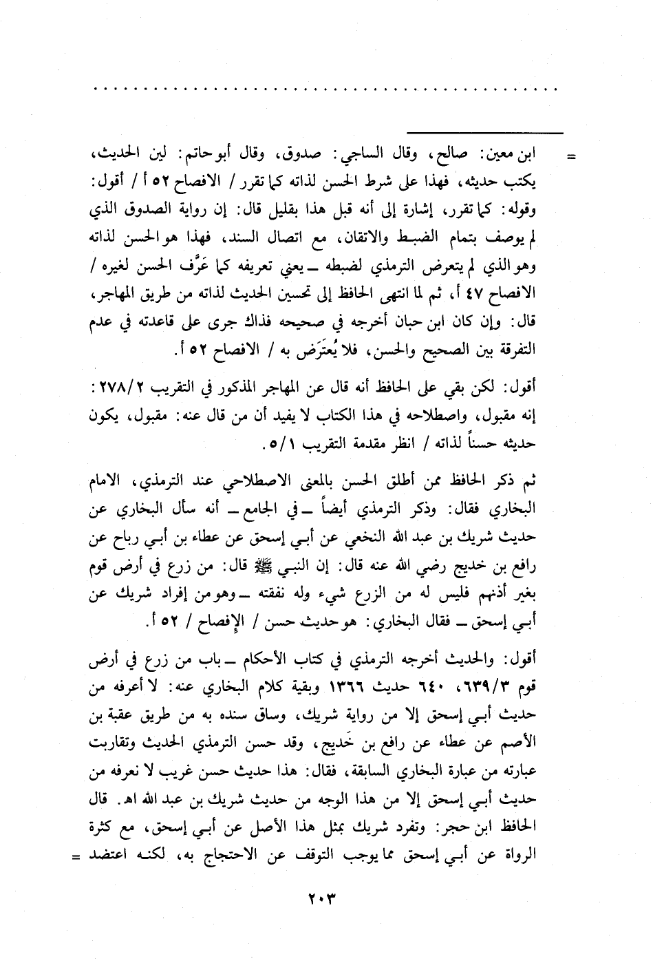 ثم ذكر الحافظ ممن أطلق الحسن بالمعنى الاصطلاحي عند الترمذي، الامام البخاري فقال: وذكر الترمذي أيضًا -في الجامع- أنه سأل البخاري عن حديث شريك بن عبد الله النخعي عن أبي إسحق عن عطاء بن أبي رباح عن رافع بن خديج رضي الله عنه قال: إن النبي -صلى الله عليه وسلم- قال: من زرع في أرض قوم بغير أذنهم فليس له من الزرع شيء وله نفقته -وهو من إفراد شريك عن أبي إسحق- فقال البخاري: هو حديثه حسن/ الإفصاح/ 52 أ.