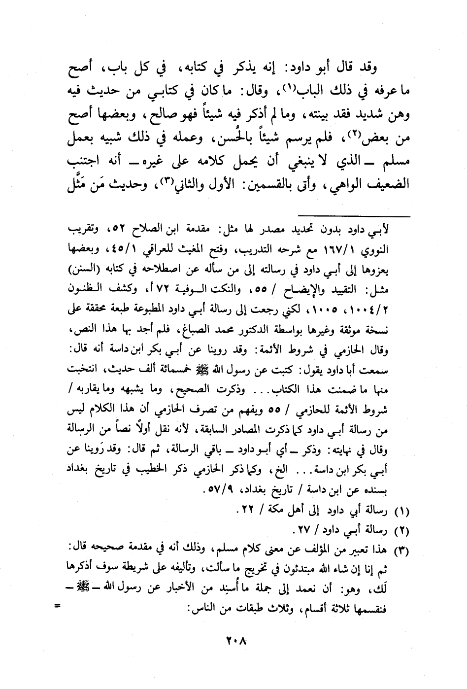 = لأبي داود بدون تحديد مصدر لها مثل: مقدمة ابن الصلاح 52، وتقريب النووي 1/ 167 مع شرحه التدريب، وفتح المغيث للعراقي 1/ 45، وبعضها يعزوها إلى أبي داود في رسالته إلى من سأله عن اصطلاحه في كتابه (السنن) مثل: التقييد والإِيضاح/ 55، والنكت الوفية 72 أ، وكشف الظنون 2/ 1004، 1005، لكني رجعت إلى رسالة أبي داود المطبوعة طبعة محققة على نسخة موثقة وغيرها بواسطة الدكتور محمد الصباغ، فلم أجد بها هذا النص، وقال الحازمي في شروط الأئمة: وقد روينا عن أبي بكر ابن داسة أنه قال: سمعت أبا داود يقول: كتبت عن رسول الله -صلى الله عليه وسلم- خمسمائة ألف حديث، انتخبت منها ما ضمنت هذا الكتاب ... وذكرت الصحيح، وما يشبهه وما يقاربه / شروط الأئمة للحازمي/ 55 ويفهم من تصرف الحازمي أن هذا الكلام ليس من رسالة أبي داود كما ذكرت المصادر السابقة، لأنه نقل أولًا نصًا من الرسالة وقال في نهايته: وذكر -أي أبو داود- باقي الرسالة، ثم قال: وقد رَوينا عن أبي بكر ابن داسة ... الخ، وكما ذكر الحازمي ذكر الخطيب في تاريخ بغداد بسنده عن ابن داسة/ تاريخ بغداد، 9/ 57.
