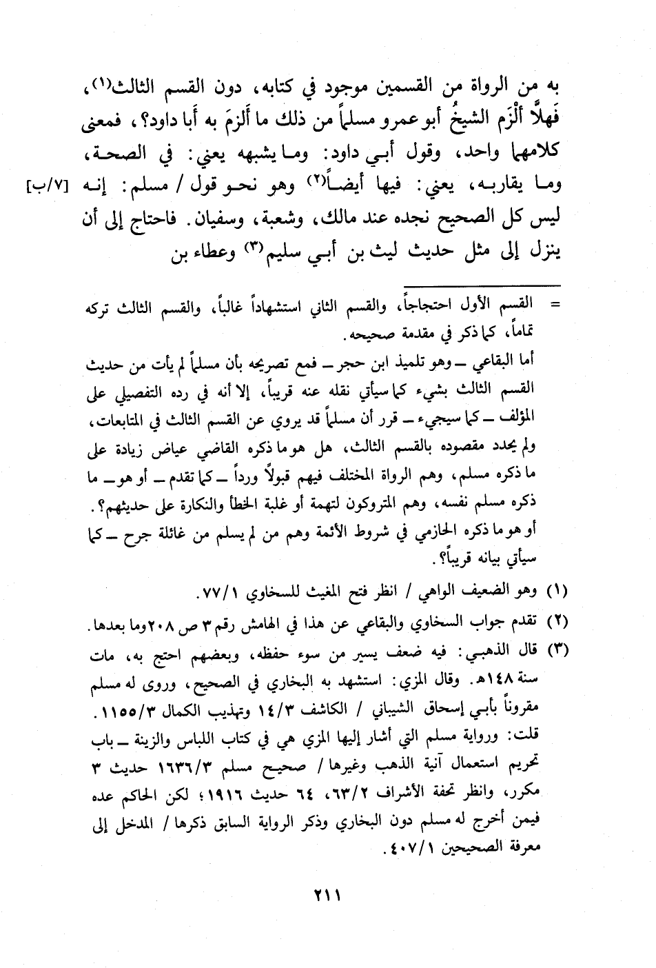 أما البقاعي -وهو تلميذ ابن حجر- فمع تصريحه بأن مسلمًا لم يأت من حديث القسم الثالث بشيء كما سيأتي نقله عنه قريبًا، إلا أنه في رده التفصيلي على المؤلف -كما سيجيء- قرر أن مسلمًا قد يروي عن القسم الثالث في المتابعات، ولم يحدد مقصوده بالقسم الثالث، هل هو ما ذكره القاضي عياض زيادة على ما ذكره مسلم، وهم الرواة المختلف فيهم قبولًا وردًا -كما تقدم - أو هو- ما ذكره مسلم نفسه، وهم المتروكون لتهمة أو غلبة الخطأ والنكارة على حديثهم؟. أو هو ما ذكره الحازمي في شروط الأئمة وهم من لم يسلم من غائلة جرح - كما سيأتي بيانه قريبًا؟.