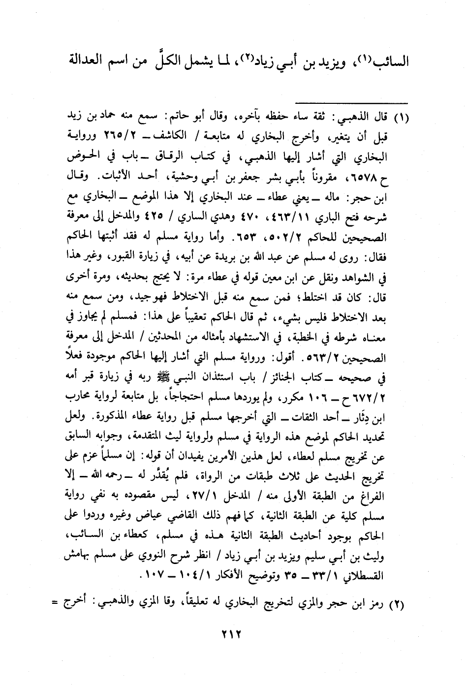 (¬1) قال الذهبي: ثقة ساء حفظه بآخره، وقال أبو حاتم: سمع منه حماد بن زيد قبل أن يتغير، وأخرج البخاري له متابعة/ الكاشف - 2/ 265 ورواية البخاري التي أشار إليها الذهبي، في كتاب الرقاق - باب في الحوض ح 6578، مقرونًا بأبي بشر جعفر بن أبي وحشية، أحد الأثبات. وقال ابن حجر: ماله -يعني عطاء- عند البخاري إلا هذا الموضع - البخاري مع شرحه فتح الباري 11/ 463، 470 وهدي الساري/ 425 والمدخل إلى معرفة الصحيحين للحاكم 2/ 502، 653. وأما رواية مسلم له فقد أثبتها الحاكم فقال: روى له مسلم عن عبد الله بن بريدة عن أبيه، في زيارة القبور، وغير هذا في الشواهد ونقل عن ابن معين قوله في عطاء مرة: لا يحتج بحديثه، ومرة أخرى قال: كان قد اختلط؛ فمن سمع منه قبل الاختلاط فهو جيد، ومن سمع منه بعد الاختلاط فليس بشيء، ثم قال الحاكم تعقيبًا على هذا: فمسلم لم يجاوز في معناه شرطه في الخطبة، في الاستشهاد بأمثاله من المحدثين/ المدخل إلى معرفة الصحيحين 2/ 563. أقول: ورواية مسلم التي أشار إليها الحاكم موجودة فعلًا في صحيحه - كتاب الجنائز/ باب استئذان النبي -صلى الله عليه وسلم- ربه في زيارة قبر أمه 2/ 672 ح - 106 مكرر، ولم يوردها مسلم احتجاجًا، بل متابعة لرواية محارب ابن دِثَار -أحد الثقات- التي أخرجها مسلم قبل رواية عطاء المذكورة. ولعل تحديد الحاكم لموضع هذه الرواية في مسلم ولرواية ليث المتقدمة، وجوابه السابق عن تخريج مسلم لعطاء، لعل هذين الأمرين يفيدان أن قوله: إن مسلمًا عزم على تخريج الحديث على ثلاث طبقات من الرواة، فلم يُقدِّر له -رحمه الله- إلا الفراغ من الطبقة الأولى منه/ المدخل 1/ 27، ليس مقصوده به نفي رواية مسلم كلية عن الطبقة الثانية، كما فهم ذلك القاضي عياض وغيره وردوا على الحاكم بوجود أحاديث الطبقة الثانية هذه في مسلم، كعطاء بن السائب، وليث بن أبي سليم ويزيد بن أبي زياد/ انظر شرح النووي على مسلم بهامش القسطلاني 1/ 33 - 35 وتوضيح الأفكار 1/ 104 - 107.