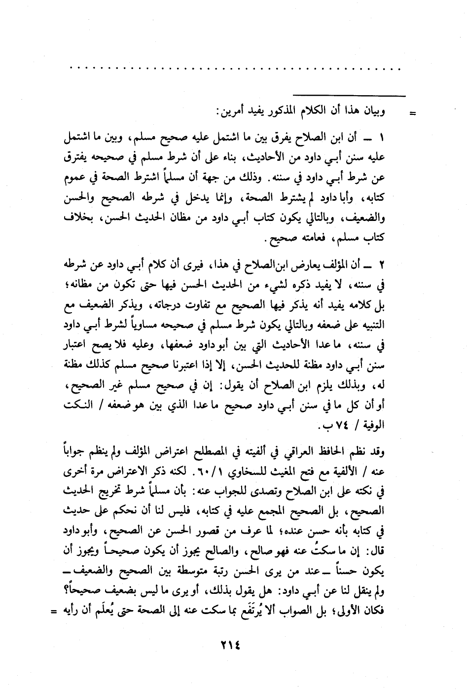 2 - أن المؤلف يعارض ابن الصلاح في هذا، فيرى أن كلام أبي داود عن شرطه في سننه، لا يفيد ذكره لشيء من الحديث الحسن فيها حتى تكون من مظانه؛ بل كلامه يفيد أنه يذكر فيها الصحيح مع تفاوت درجاته، ويذكر الضعيف مع التنبيه على ضعفه وبالتالي يكون شرط مسلم في صحيحه مساويًا لشرط أبي داود في سننه، ما عدا الأحاديث التي بين أبو داود ضعفها، وعليه فلا يصح اعتبار سنن أبي داود مظنة للحديث الحسن، إلا إذا اعتبرنا صحيح مسلم كذلك مظنة له، وبذلك يلزم ابن الصلاح أن يقول: إن في صحيح مسلم غير الصحيح، أو أن كل ما في سنن أبي داود صحيح ما عدا الذي بين هو ضعفه/ النكت الوفية/ 74 ب.