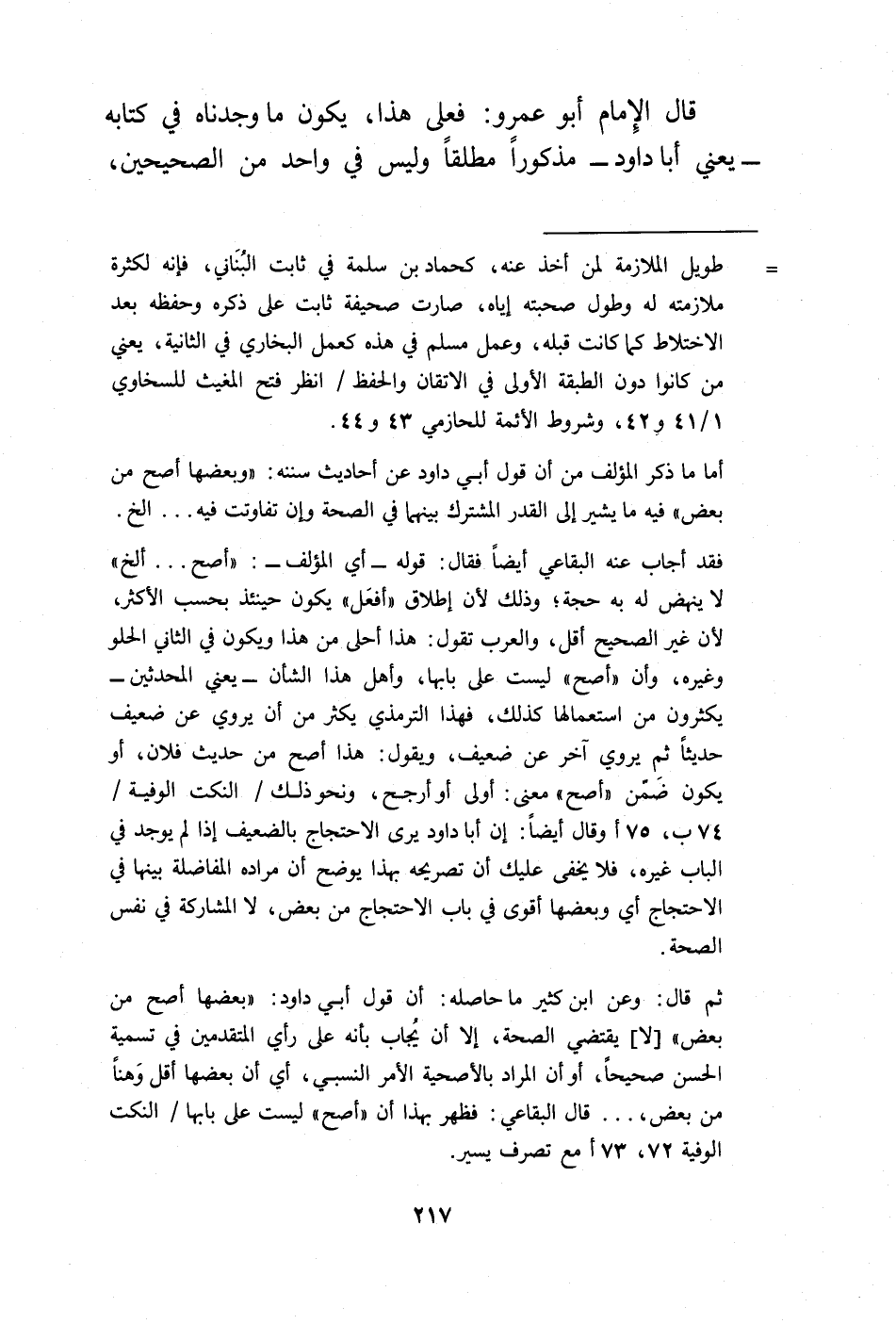 قال الإِمام أبو عمرو: فعلى هذا، يكون ما وجدناه في كتابه -يعني أبا داود- مذكورًا مطلقًا وليس في واحد من الصحيحين،