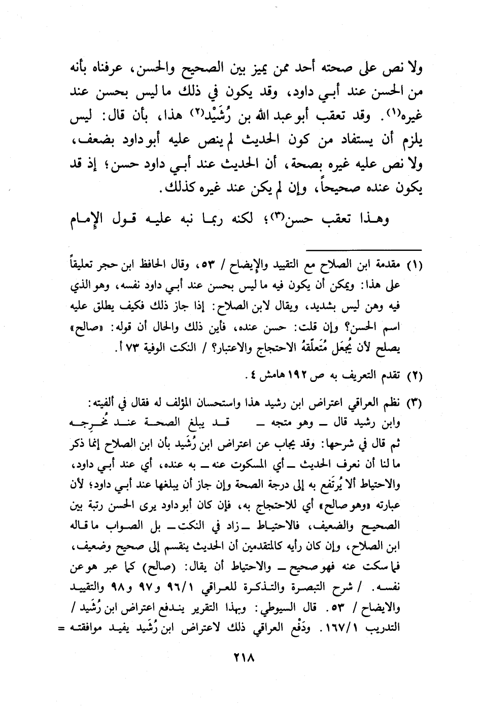 (¬3) نظم العراقي اعتراض ابن رشيد هذا واستحسان المؤلف له فقال في ألفيته: وابن رشيد قال -وهو متجه- قد يبلغ الصحة عند مُخرِجه ثم قال في شرحها: وقد يجاب عن اعتراض ابن رُشَيد بأن ابن الصلاح إنما ذكر ما لنا أن نعرف الحديث -أي المسكوت عنه- به عنده، أى عند أبي داود، والاحتياط ألا يُرتَفع به إلى درجة الصحة وإن جاز أن يبلغها عند أبي داود؛ لأن عبارته "وهو صالح" أي للاحتجاج به، فإن كان أبو داود يرى الحسن رتبة بين الصحيح والضعيف، فالاحتياط -زاد في النكت- بل الصواب ما قاله ابن الصلاح، وإن كان رأيه كالمتقدمين أن الحديث ينقسم الى صحيح وضعيف، فما سكت عنه فهو صحيح - والاحتياط أن يقال: (صالح) كما عبر هو عن نفسه./ شرح التبصرة والتذكرة للعراقي 1/ 96 و 97 و 98 والتقييد والايضاح/ 53. قال السيوطي: وبهذا التقرير يندفع اعتراض ابن رُشَيد/ التدريب 1/ 167. ودَفْع العراقي ذلك لاعتراض ابن رُشَيد يفيد موافقته =