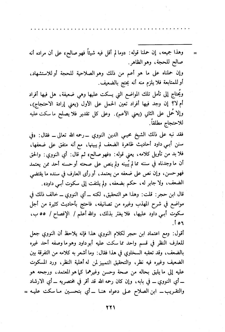 أقول: ومع اعتماد ابن حجر لكلام النووي هذا فإنه يلاحظ أن النووي جعل للعارف النظر في قسم واحد مما سكت عليه أبو داود وهو ما وصفه أحد غيره بالضعف، وقد تعقبه السخاوي في هذا فقال: وما أشعر به كلامه من التفرقة بين الضعيف وغيره فيه نظر، والتحقيق التمييز لمن له أهلية النظر، ورد المسكوت عليه إلى ما يليق بحاله من صحة وحسن وغيرهما كما هو المعتمد، ورجحه هو -أي النووي- في بابه، وإن كان رحمه الله قد أقر في مختصريه -أي الارشاد والتقريب- ابن الصلاح على دعواه هنا -أي بتحسين ماسكت عليه =