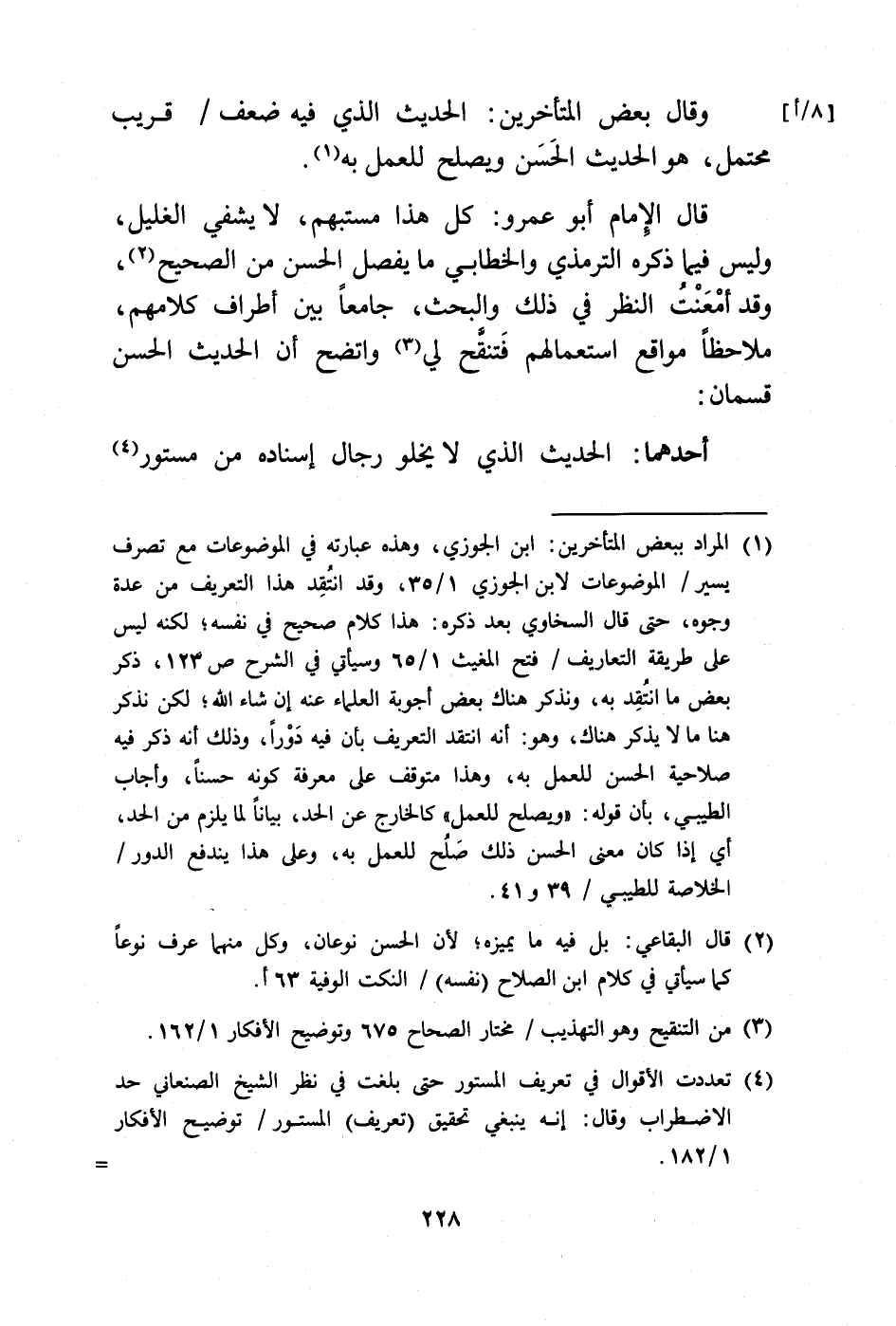 (¬1) المراد ببعض المتأخرين: ابن الجوزي، وهذه عبارته في الموضوعات مع تصرف يسير/ الموضوعات لابن الجوزي 1/ 35، وقد انتُقِد هذا التعريف من عدة وجوه، حتى قال السخاوي بعد ذكره: هذا كلام صحيح في نفسه؛ لكنه ليس على طريقة التعاريف/ فتح المغيث 1/ 65 وسيأتي في الشرح ص 123، ذكر بعض ما انتُقِد به، ونذكر هناك بعض أجوبة العلماء عنه إن شاء الله؛ لكن نذكر هنا ما لا يذكر هناك، وهو: أنه انتقد التعريف بأن فيه دَوْرًا، وذلك أنه ذكر فيه صلاحية الحسن للعمل به، وهذا متوقف على معرفة كونه حسنًا، وأجاب الطيبي، بأن قوله: "ويصلح للعمل" كالخارج عن الحد، بيانًا لما يلزم من الحد، أي إذا كان معنى الحسن ذلك صَلُح للعمل به، وعلى هذا يندفع الدور/ الخلاصة للطيبي/ 39 و 41.