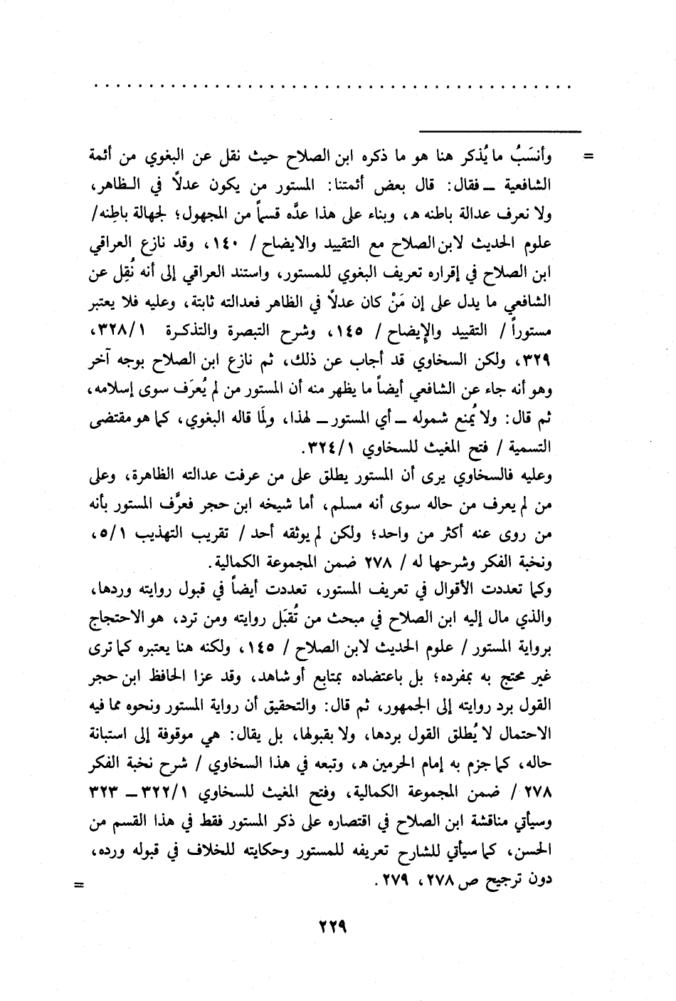 وكما تعددت الأقوال في تعريف المستور، تعددت أيضًا في قبول روايته وردها، والذي مال إليه ابن الصلاح في مبحث من تُقبَل روايته ومن ترد، هو الاحتجاج برواية المستور/ علوم الحديث لابن الصلاح/ 145، ولكنه هنا يعتبره كما ترى غير محتج به بمفرده؛ بل باعتضاده بمتابع أو شاهد، وقد عزا الحافظ ابن حجر القول برد روايته إلى الجمهور، ثم قال: والتحقيق أن رواية المستور ونحوه مما فيه الاحتمال لا يُطلق القول بردها، ولا بقبولها، بل يقال: هي موقوفة إلى استبانة حاله، كما جزم به إمام الحرمين هـ، وتبعه في هذا السخاوي/ شرح نخبة الفكر 278 / ضمن المجموعة الكمالية، وفتح المغيث للسخاوي 1/ 322 - 323 وسيأتي مناقشة ابن الصلاح في اقتصاره على ذكر المستور فقط في هذا القسم من الحسن، كما سيأتي للشارح تعريفه للمستور وحكايته للخلاف في قبوله ورده، دون ترجيح ص 278، 279 =