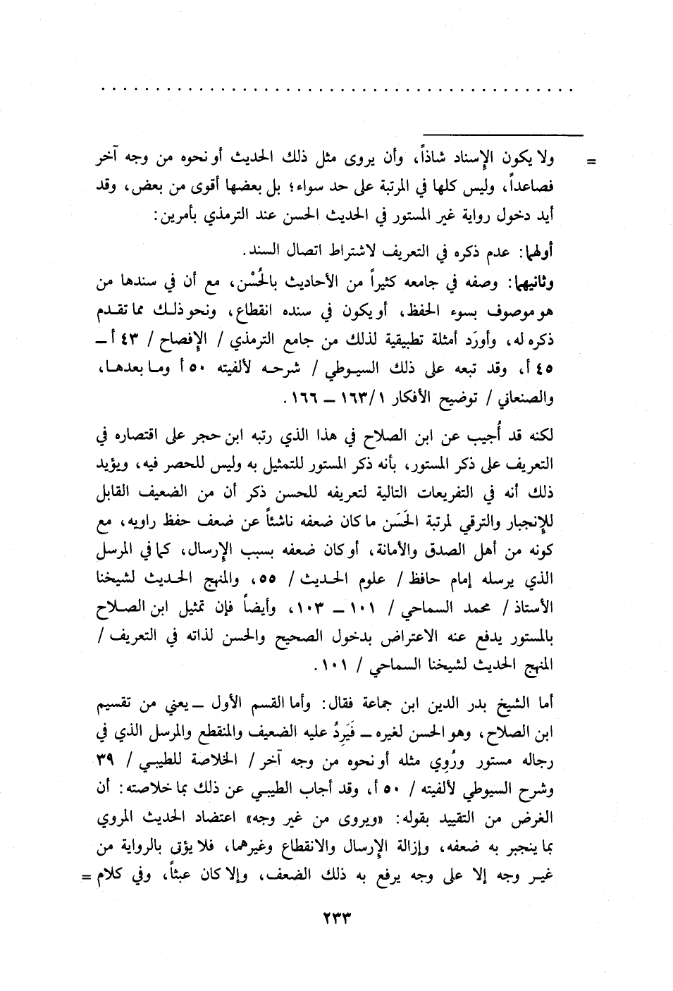 = ولا يكون الإسناد شاذًا، وأن يروى مثل ذلك الحديث أو نحوه من وجه آخر فصاعدًا، وليس كلها في المرتبة على حد سواء؛ بل بعضها أقوى من بعض، وقد أيد دخول رواية غير المستور في الحديث الحسن عند الترمذي بأمرين: