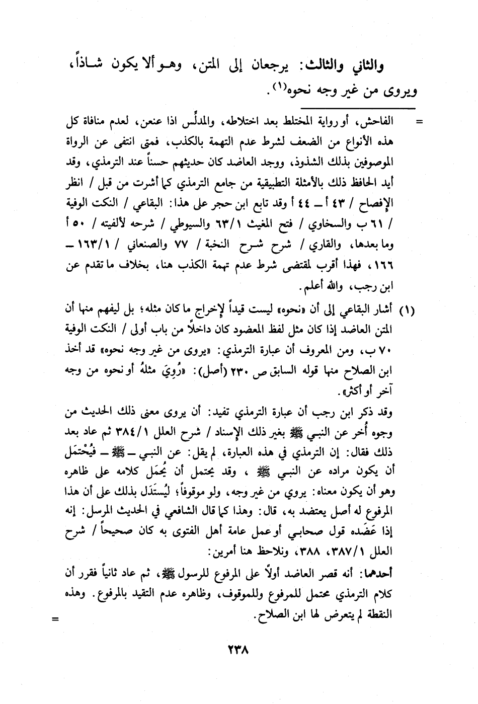 (¬1) أشار البقاعي إلى أن "نحوه" ليست قيدًا لإِخراج ما كان مثله؛ بل ليفهم منها أن المتن العاضد إذا كان مثل لفظ المعضود كان داخلًا من باب أولى/ النكت الوفية 70 ب، ومن المعروف أن عبارة الترمذي: "يروى من غير وجه نحوه" قد أخذ ابن الصلاح منها قوله السابق ص 230 (أصل): "رُوِيَ مثلهُ أو نحوه من وجه آخر أو أكثر".